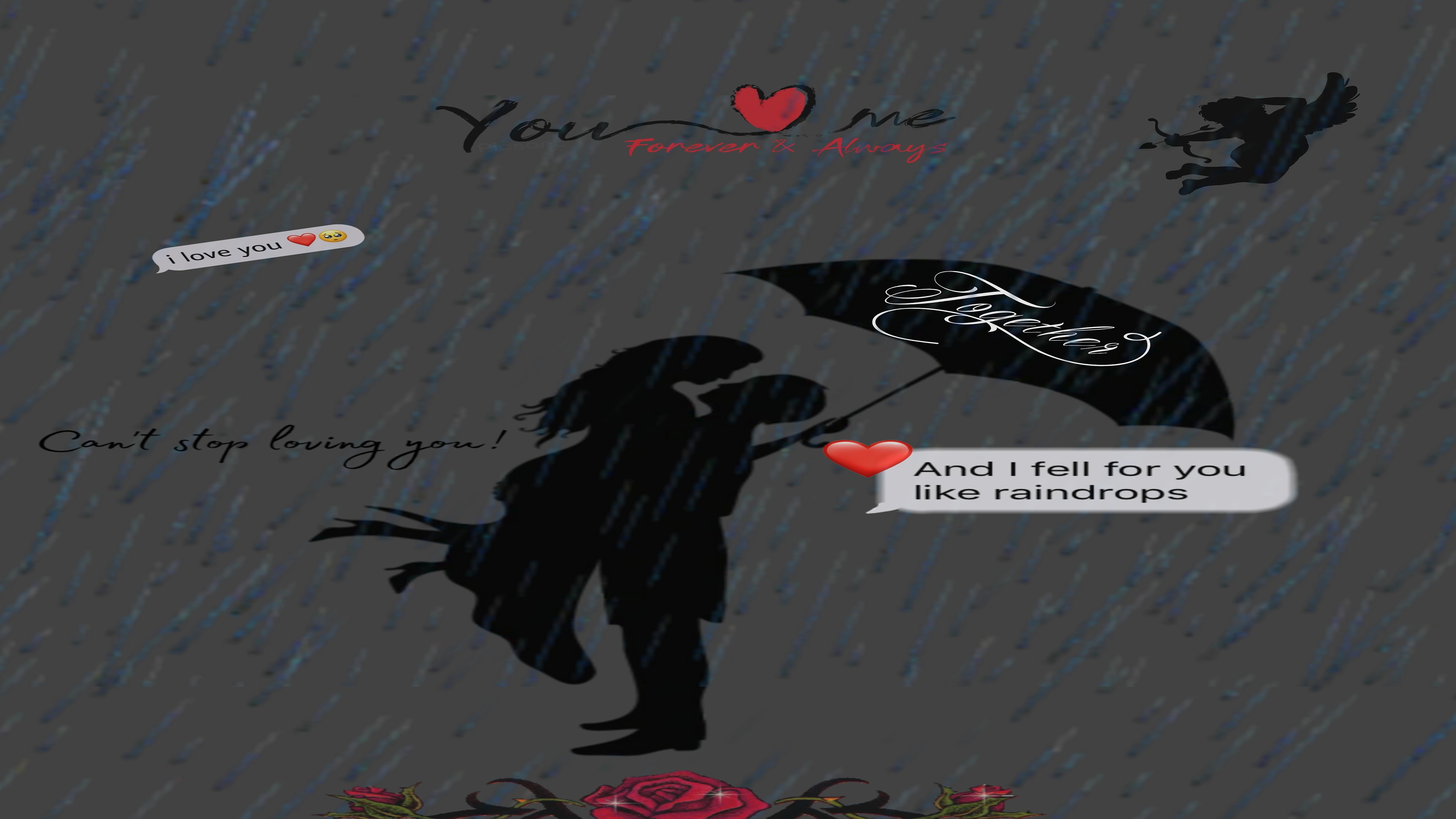 Immerse yourself in the enchanting world of love with this stunning Romantic Rainy Day HD Wallpaper. Featuring a silhouette of a couple embracing under a black umbrella, this artwork captures the essence of romance amidst a gentle rain. The backdrop is a soft gray, evoking a serene atmosphere that complements the emotional connection between the figures. With the heartfelt quote, "And I fell for you like raindrops," this wallpaper is perfect for those who cherish love and the beauty of shared moments. The overall mood is warm and intimate, making it an ideal choice for your desktop or mobile background.