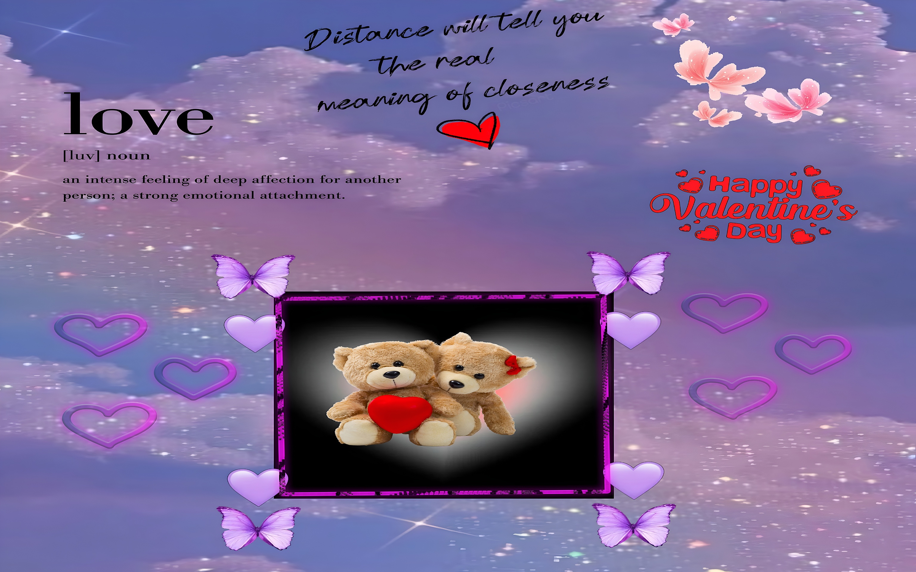 The background features a celestial-inspired sky with shimmering stars and fluffy clouds in delicate shades of purple and pink, evoking a dreamy, ethereal mood. Decorative elements such as purple butterflies and heart shapes float gracefully around the central image, enhancing the romantic and whimsical feel. This wallpaper also includes meaningful text that defines love and a touching quote about closeness, adding a poetic layer to the visual experience.