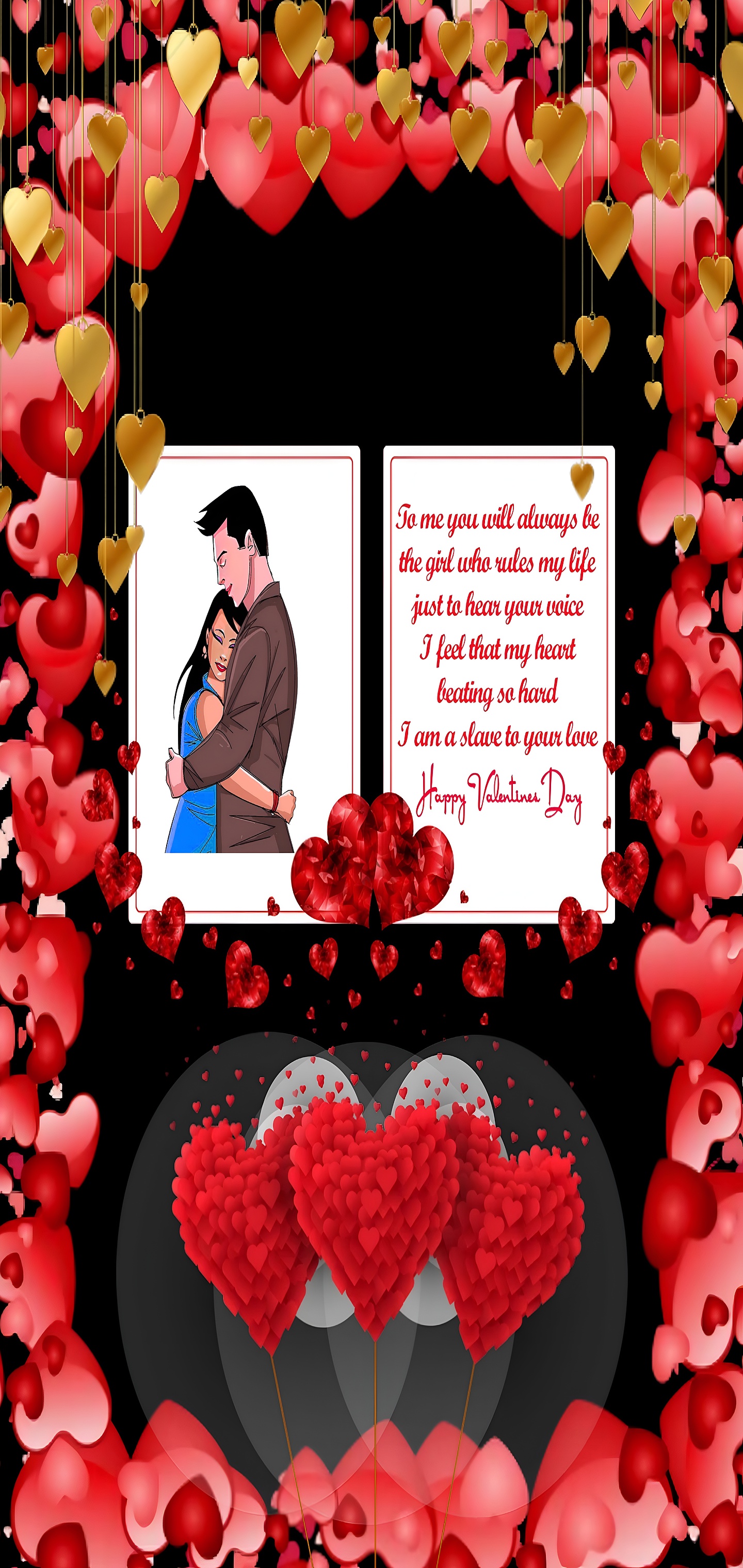The wallpaper’s artistic style blends digital illustration with decorative elements, featuring a harmonious palette of vibrant red, golden yellow, soft pink, and deep black. The red hearts symbolize passion and romance, while the golden hearts add a luxurious and warm glow, enhancing the celebratory feel. The use of black as a backdrop intensifies the visual impact, making the colors stand out crisply and clearly. The texture of the heart balloons, formed by clusters of smaller hearts, adds depth and a playful yet elegant dimension to the design. This romantic art piece is perfect as a desktop background, mobile wallpaper, or wall art for Valentine’s Day and other love-themed occasions.