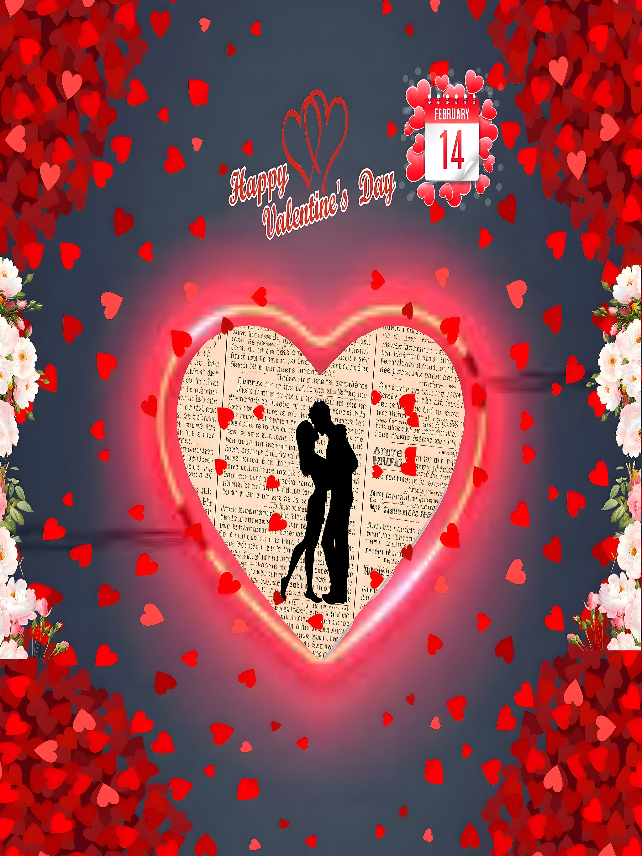 This Romantic Valentine's Day Heart Wallpaper beautifully captures the essence of love and affection with a striking visual composition. At the center, a glowing heart-shaped frame encloses a silhouette of a couple sharing an intimate moment, set against a textured newspaper-style background. The design is surrounded by a cascade of vibrant red hearts that seem to float gently across the dark gray backdrop, creating a dynamic and heartfelt atmosphere. Soft white and pink floral accents on the corners add a delicate touch, enhancing the romantic theme. This wallpaper is perfect for anyone looking to celebrate love with a warm and artistic desktop or mobile background.