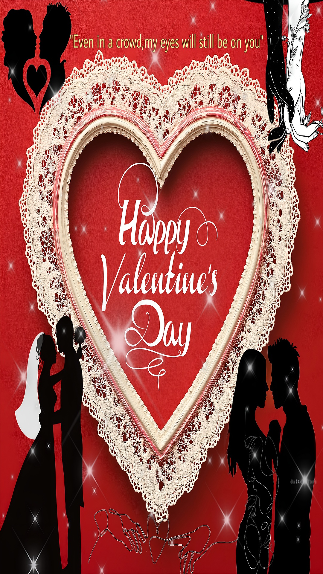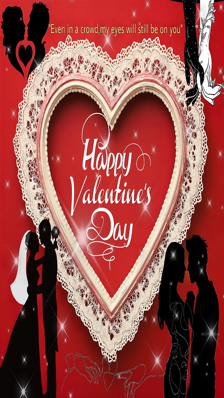 The wallpaper’s dominant colors—deep red, cream lace, black silhouettes, and white highlights—work harmoniously to evoke feelings of warmth, elegance, and intimacy. The lace texture around the heart adds a vintage charm, while the silhouettes of couples in various romantic gestures bring life and emotion to the scene. The sparkling star-like accents scattered across the image enhance the dreamy and celebratory mood, making it a perfect romantic desktop background or mobile wallpaper for Valentine’s Day or any special occasion.