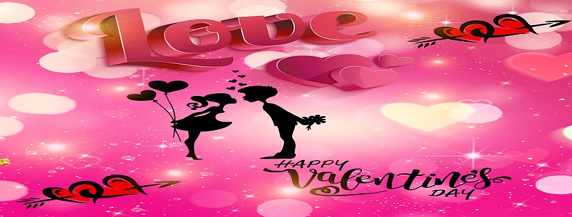 This Romantic Valentine's Day Love Art wallpaper captures the essence of affection and tender moments with a charming silhouette of a young couple sharing a sweet kiss. The boy holds a bouquet of flowers behind his back, while the girl carries heart-shaped balloons, symbolizing love and surprise. The background is a dreamy blend of vibrant pink hues, soft white bokeh lights, and sparkling stars, creating a magical and warm atmosphere perfect for expressing love and romance.