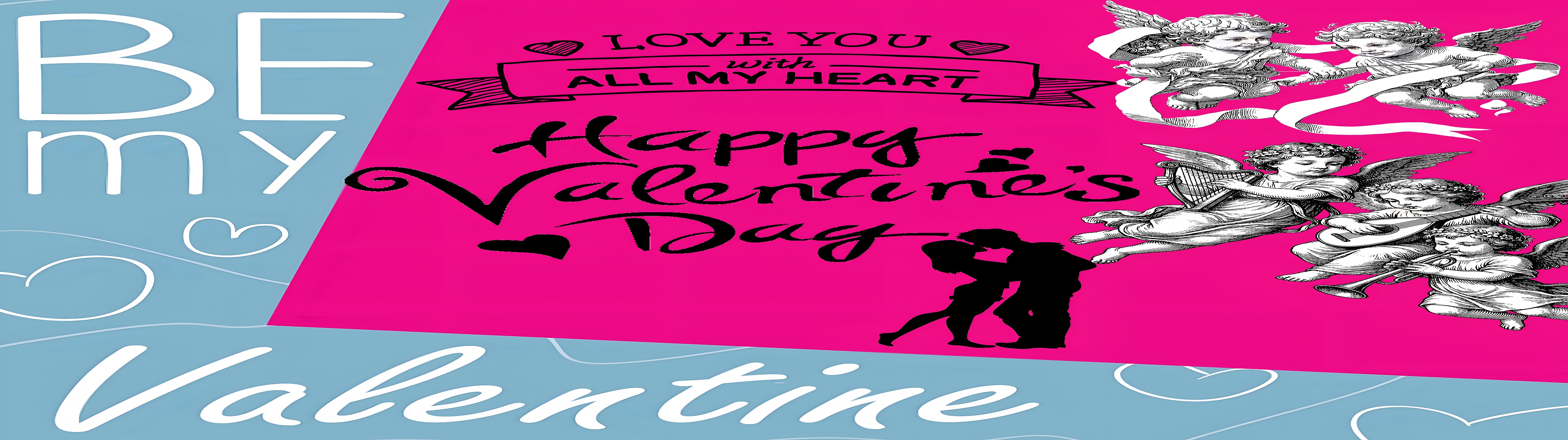 This Romantic Valentine's Day Love Art wallpaper beautifully captures the essence of love and affection with its vibrant and playful design. The main visual focus is a bold pink square featuring a heartfelt message that reads "Love You with All My Heart" and "Happy Valentine's Day" in charming, handwritten-style typography. A black silhouette of a couple sharing a tender kiss adds a romantic and intimate touch, perfectly complementing the affectionate theme. Surrounding the couple are intricately detailed cherub angels playing musical instruments, rendered in a classic, vintage illustration style that adds a timeless elegance to the composition.