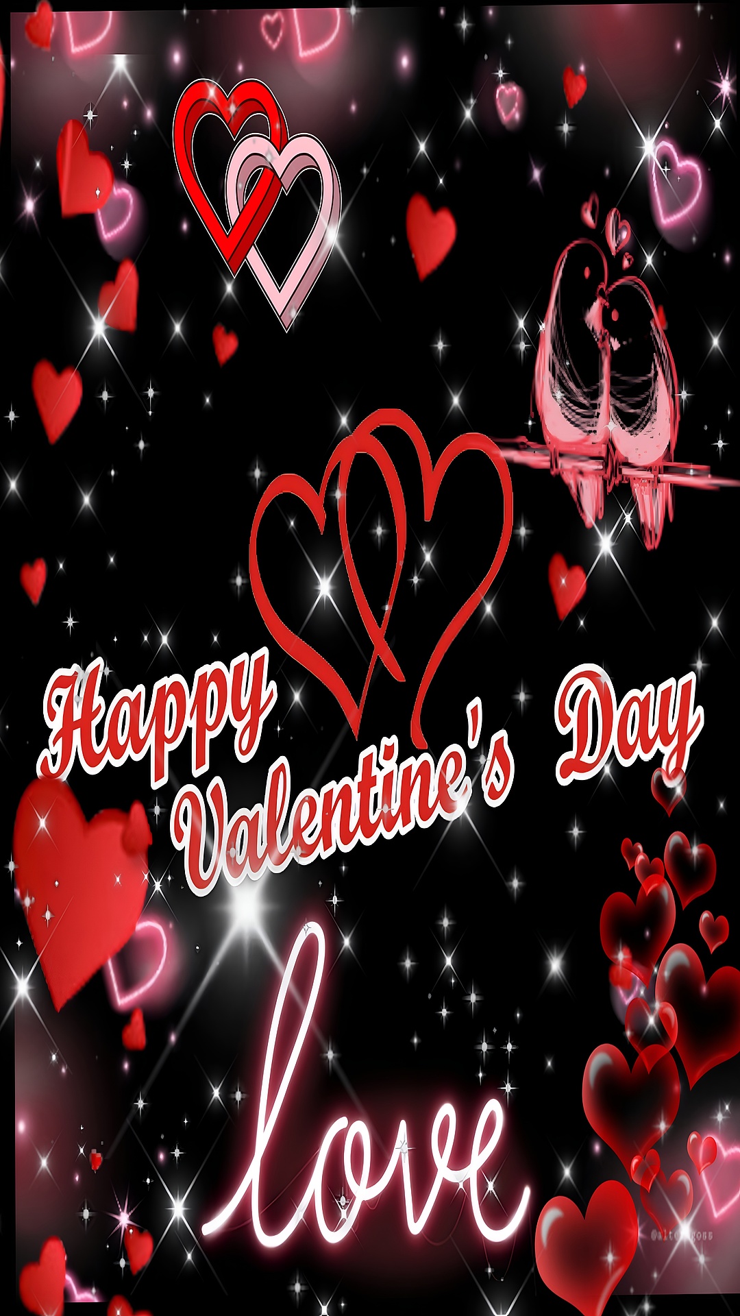 The wallpaper's artistic style combines digital illustration with glowing neon effects, emphasizing the romantic theme through vivid colors and sparkling highlights. The dominant vibrant red hearts symbolize passion and love, while the soft pink hearts add tenderness and warmth. The glowing white sparkles scattered across the black backdrop enhance the overall mood, evoking a sense of magic and celebration. The delicate depiction of two birds sharing a loving moment on a branch adds a charming, symbolic layer of affection and companionship. This blend of colors and elements creates a visually captivating and emotionally resonant design that stands out as a high-definition background for any romantic setting.
