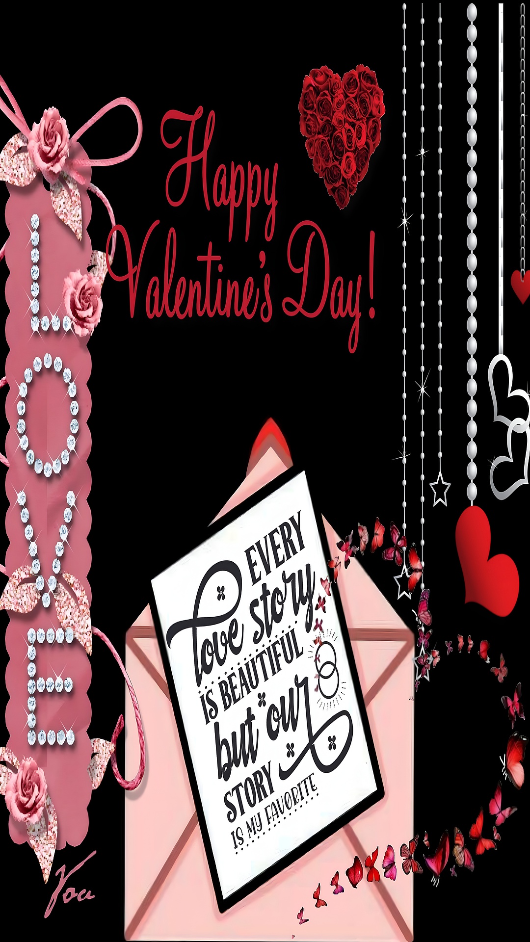 This Romantic Valentine's Day Love Card wallpaper captures the essence of heartfelt affection with its beautifully crafted design and warm color palette. The main focus is a pink envelope slightly open, revealing a white card with an inspiring love quote in elegant black script: "Every love story is beautiful but our story is my favorite." Surrounding the card is a delicate swirl of red and pink butterflies forming a heart shape, adding a whimsical and tender touch to the composition. To the left, the word "LOVE" is spelled vertically with sparkling diamond-like letters on a pink scalloped ribbon adorned with glittery bows and roses, enhancing the romantic atmosphere. The background is a deep black, providing a striking contrast that makes the reds, pinks, and whites pop vividly.