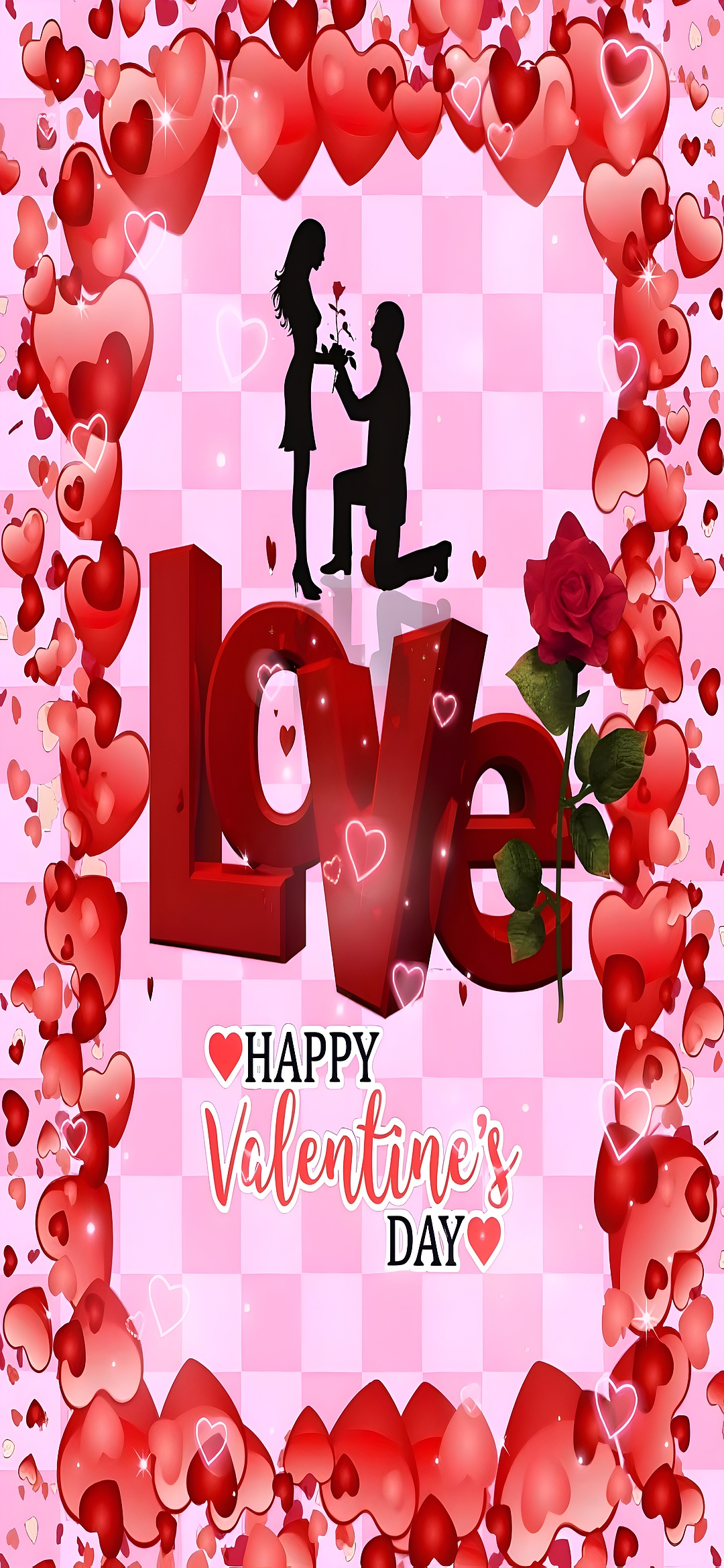This Romantic Valentine's Day Love Wallpaper beautifully captures the essence of love and affection with a visually striking design. At the center, a silhouette of a man kneeling and offering a rose to a woman creates a tender and intimate proposal scene that resonates deeply with the theme of romance. The large, bold 3D red "Love" text anchors the composition, while a vivid red rose adds a natural touch of passion and sincerity. Surrounding the central imagery is a dynamic frame of floating red and pink hearts, which enhances the overall romantic atmosphere and adds a sense of movement and joy.