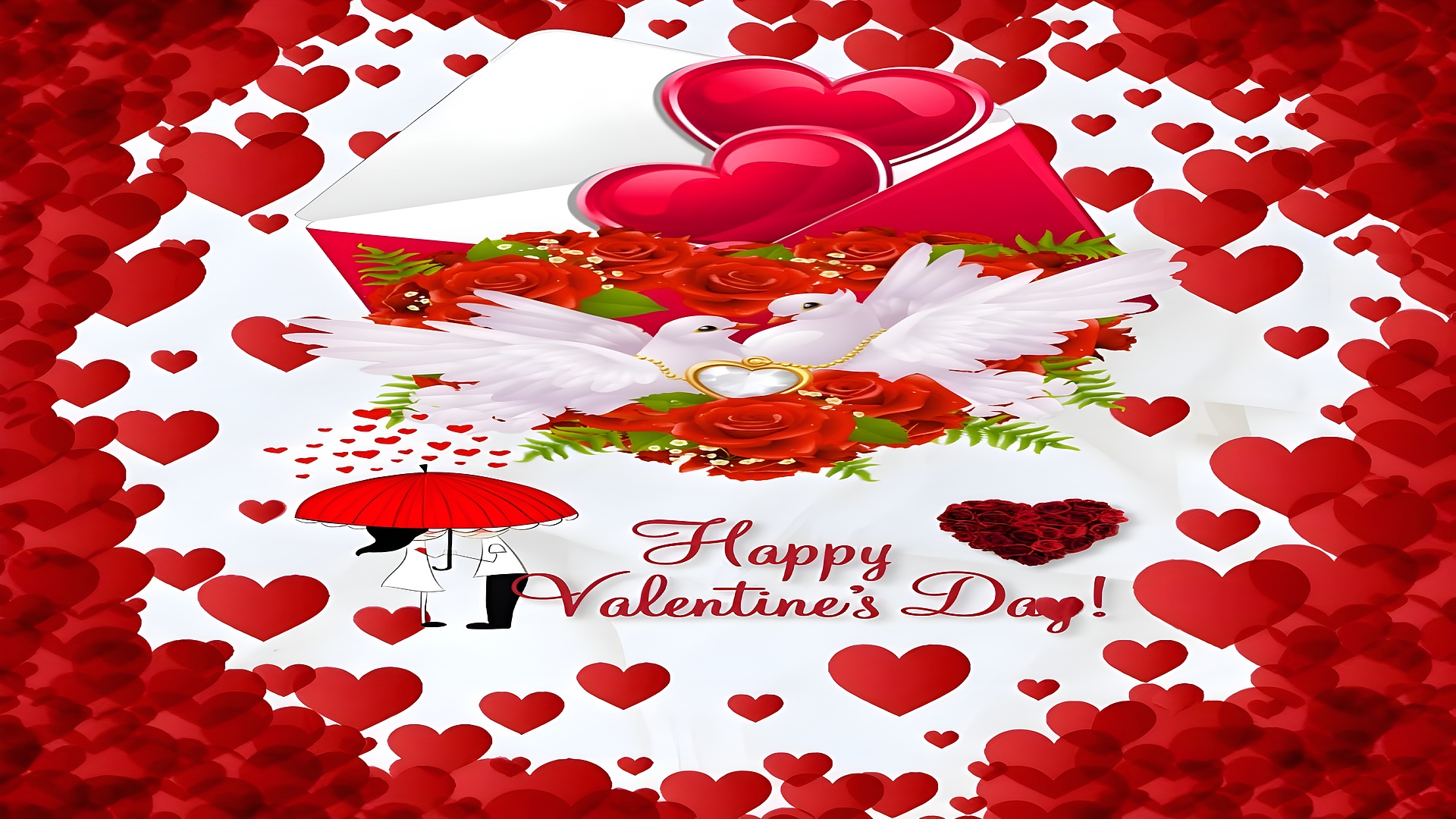This Romantic Valentine's Day Love Wallpaper beautifully captures the essence of love and celebration with a vibrant and heartwarming design. The main subject is an open red envelope overflowing with a lush bouquet of red roses, symbolizing passion and romance. Nestled within the bouquet are two elegant white doves, representing peace and eternal love, connected by a delicate heart-shaped pendant that adds a touch of refined elegance. Surrounding this central motif is a cascade of vivid red hearts that frame the entire image, creating a dynamic and immersive romantic atmosphere. The wallpaper features a charming illustration of a couple sharing an intimate moment under a red umbrella, adding a whimsical and tender human touch to the composition.