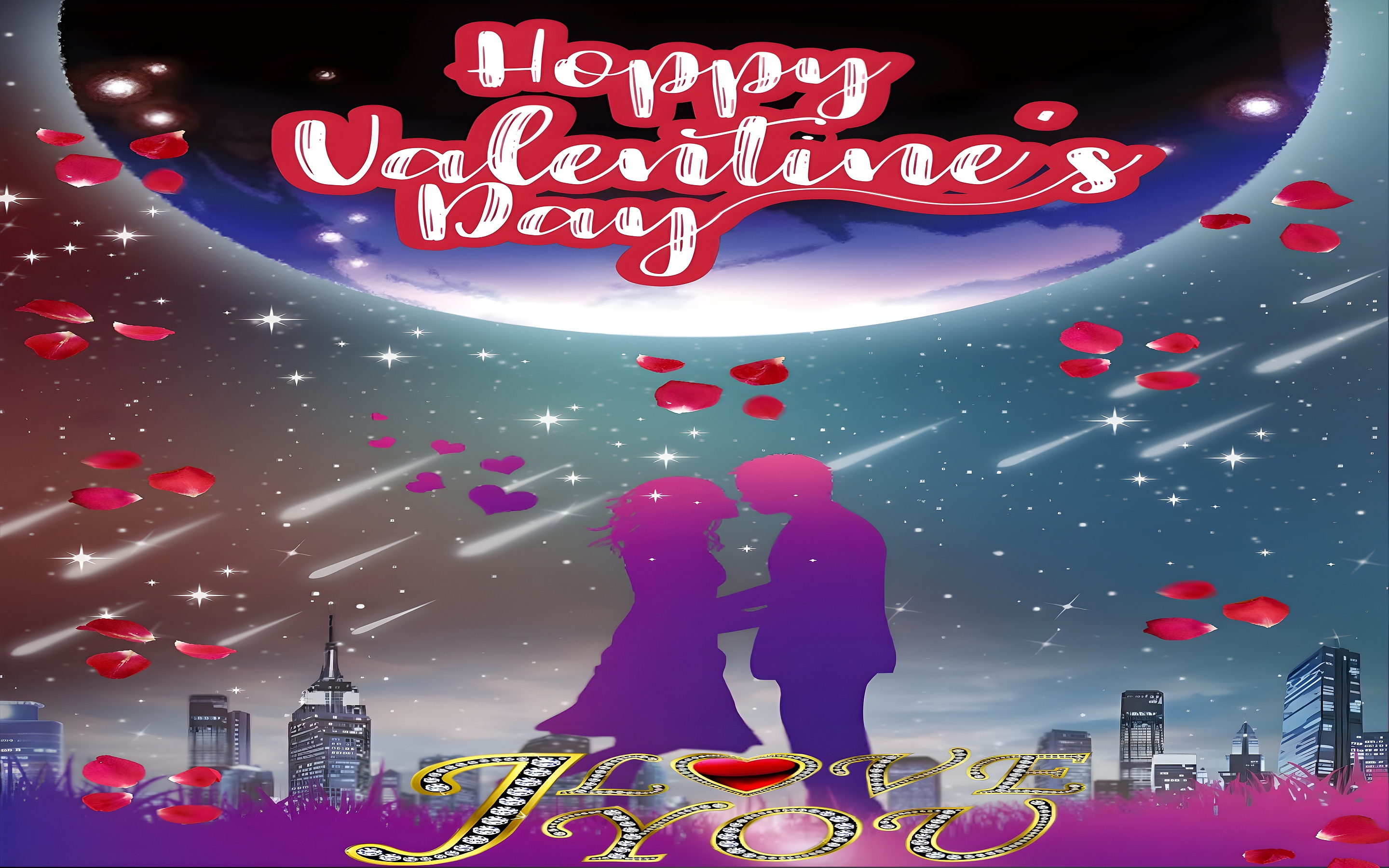 Celebrate the spirit of love with this enchanting Romantic Valentine's Day Love Silhouette HD wallpaper, a perfect blend of romance and cosmic wonder. This captivating digital artwork features a purple-toned silhouette of a couple tenderly embracing against a dreamy city skyline backdrop. The scene is set beneath a glowing, oversized moon that casts a soft blue and white light, creating a magical atmosphere filled with twinkling stars and gentle streaks of light resembling falling meteors. The romantic mood is further accentuated by scattered vibrant red rose petals drifting through the night sky, adding a passionate touch to this high-resolution wallpaper.