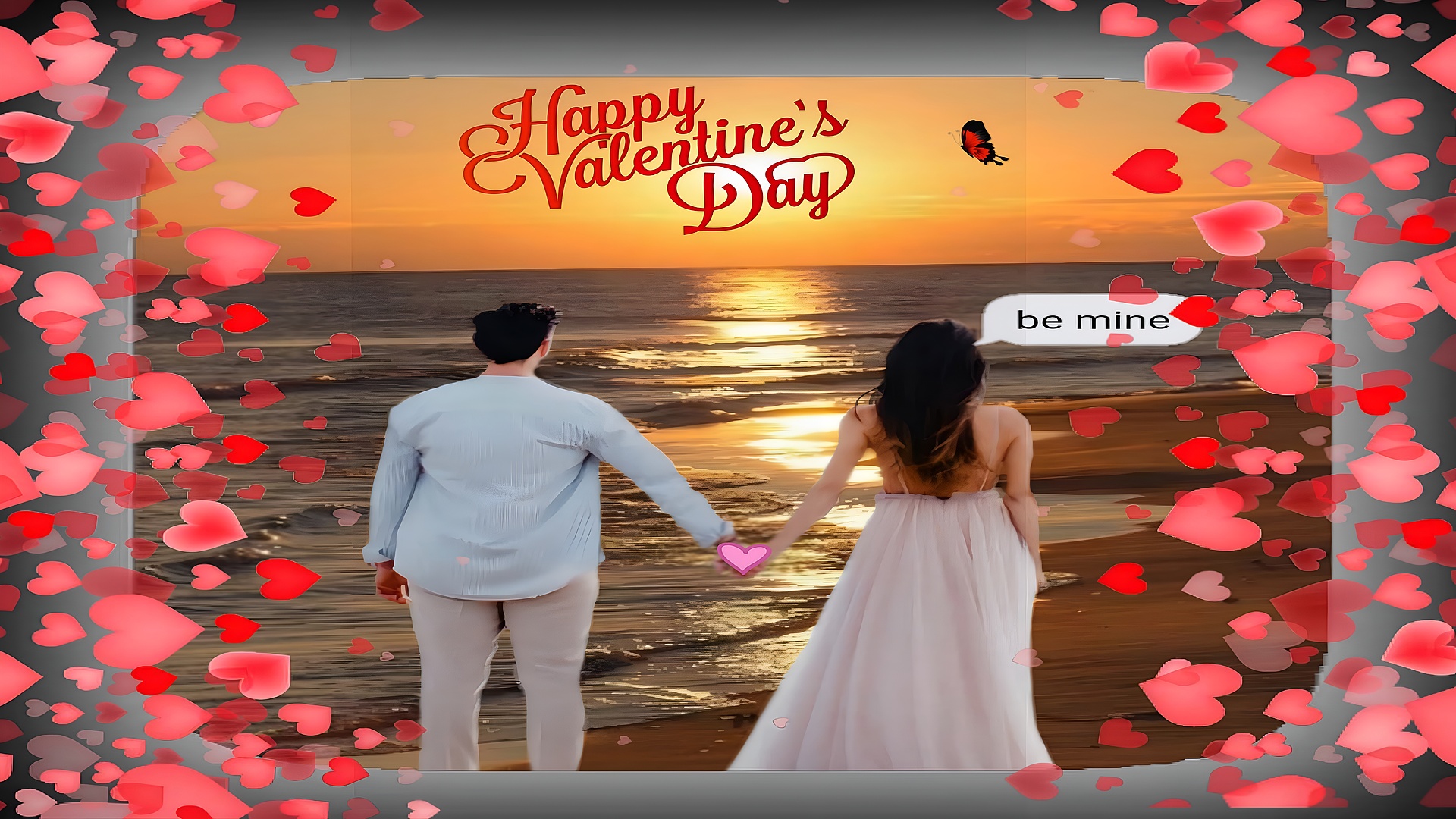 Perfect for lovers of romantic and seasonal imagery, this wallpaper combines natural beauty with festive Valentine’s Day elements. The text "Happy Valentine's Day" elegantly overlays the sky in a classic red script, while a small speech bubble near the woman reads "be mine," adding a sweet and personal touch. This blend of natural sunset colors with decorative heart motifs makes this wallpaper an ideal choice for anyone seeking a warm and loving desktop or mobile background.