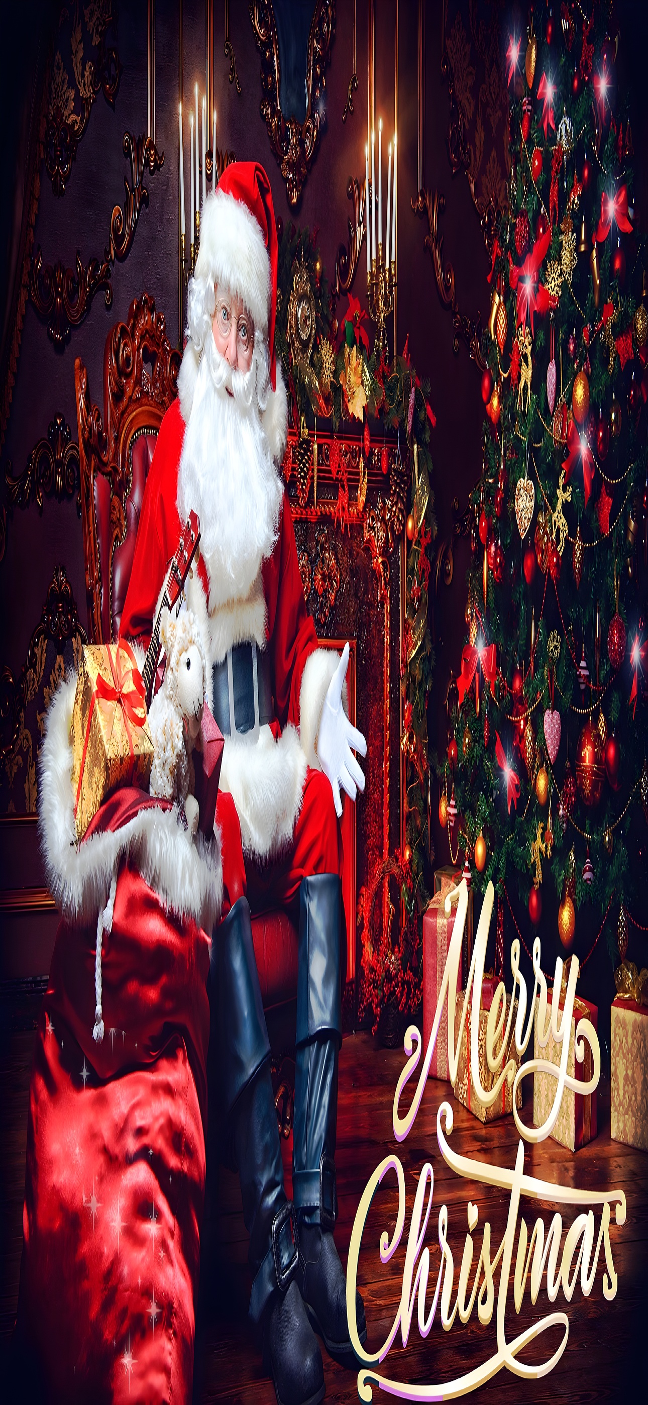 Santa Christmas gifts tree heartwarming image features Santa Claus seated in a regal red chair, surrounded by glowing candles, ornate holiday décor, and a beautifully adorned Christmas tree. His iconic red suit, white beard, and joyful expression evoke the spirit of giving and warmth. A plush red sack overflowing with wrapped presents and a cuddly teddy bear rests beside him, ready to delight children around the world. The rich, warm tones and intricate background details make this wallpaper perfect for adding seasonal cheer to your device. Ideal for those who love traditional holiday scenes with a touch of elegance, this image brings the joy of Christmas to life in vivid HD clarity.