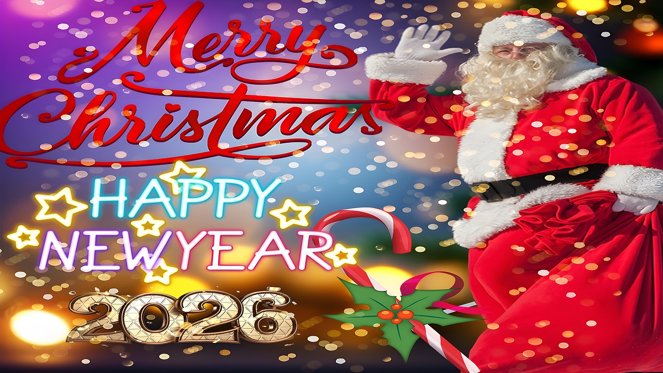 Santa Christmas new year 2026 this HD wallpaper captures the essence of holiday cheer with a joyful Santa Claus waving amidst a dazzling backdrop of multicolored lights and bokeh sparkles. The festive design features warm greetings like “Merry Christmas” in elegant red cursive and “Happy New Year” in glowing neon-style text, complemented by a bold metallic “2026” at the bottom. A candy cane and holly graphic add a playful touch, making this image perfect for spreading seasonal joy. Ideal for those who love bright, celebratory visuals, this wallpaper brings warmth and excitement to your screen throughout the holidays.