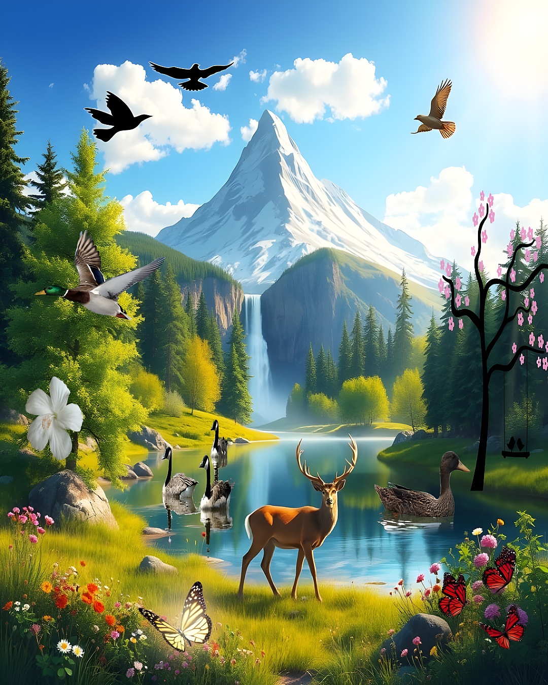 This high-resolution wallpaper showcases a diverse array of wildlife, including a stately deer, mallard ducks in flight, Canada geese wading in the water, and delicate butterflies fluttering among colorful wildflowers. The scene is set against a backdrop of towering pine trees and a majestic mountain peak with snow-covered slopes, under a bright blue sky dotted with soft clouds. The waterfall adds a natural focal point, enhancing the tranquil mood. This nature scene is ideal for desktop backgrounds, mobile wallpapers, and wall art that celebrates the beauty of wildlife and the great outdoors in vivid detail and vibrant colors.