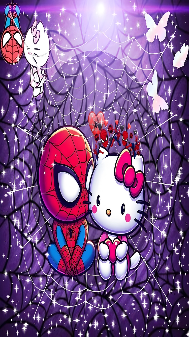 Dive into the enchanting world of our Spider-Man and Hello Kitty wallpaper, where two beloved characters unite in a delightful embrace. This vibrant HD wallpaper showcases Spider-Man, with his iconic vibrant red suit and web-slinging charm, sitting closely with the adorable Hello Kitty, who is adorned with her signature pink bow. The backdrop features a mesmerizing deep purple hue, creating a dreamy atmosphere that enhances the whimsical nature of this artwork. The intricate web design adds a playful touch, making it perfect for fans of both characters.