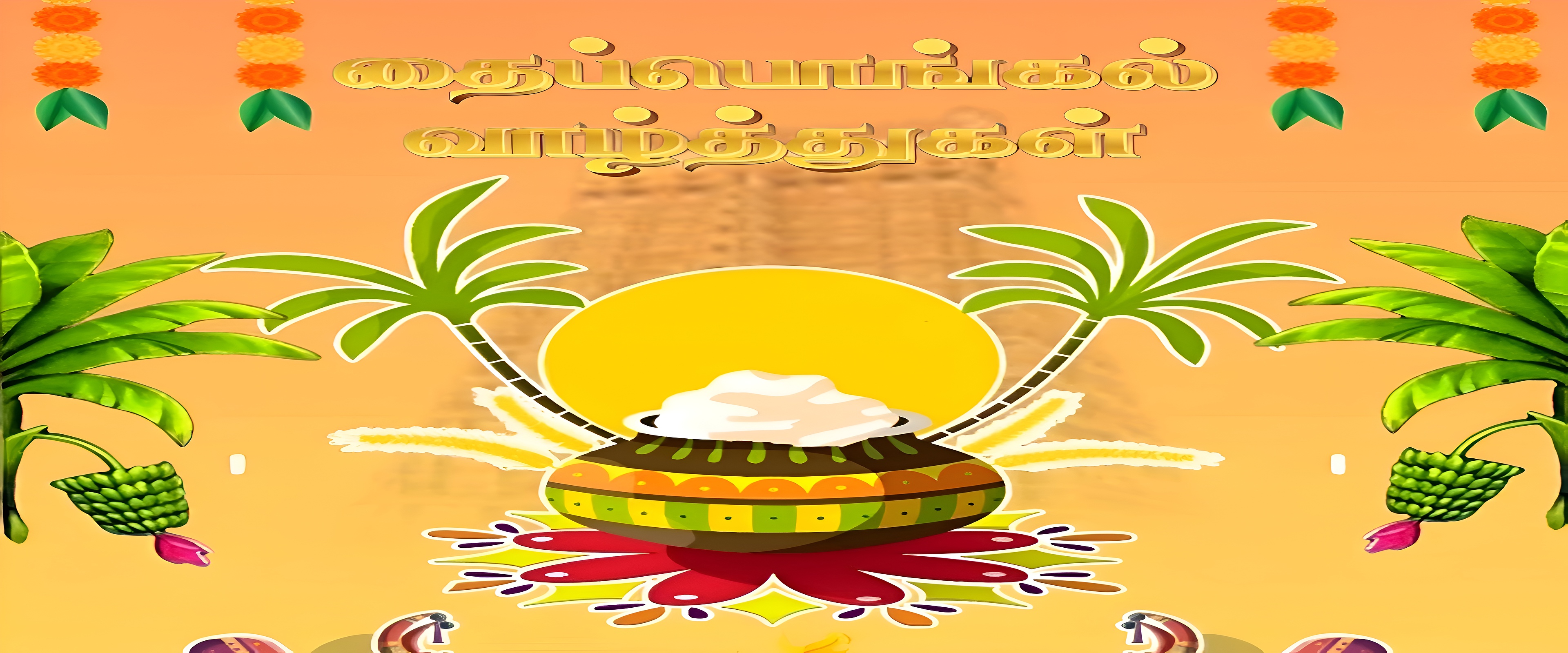 The wallpaper’s design is rich with cultural symbolism and festive spirit, making it an ideal choice for those seeking a high-resolution wallpaper that celebrates Tamil heritage and the joyous Pongal festival. The warm orange and yellow palette creates a welcoming and uplifting mood, while the lush green leaves add freshness and vitality to the composition. This premium HD wallpaper 5760×5760 resolution ensures crisp details and vibrant colors, perfect for desktop backgrounds, mobile wallpapers, and wall art that honors this important cultural event.
