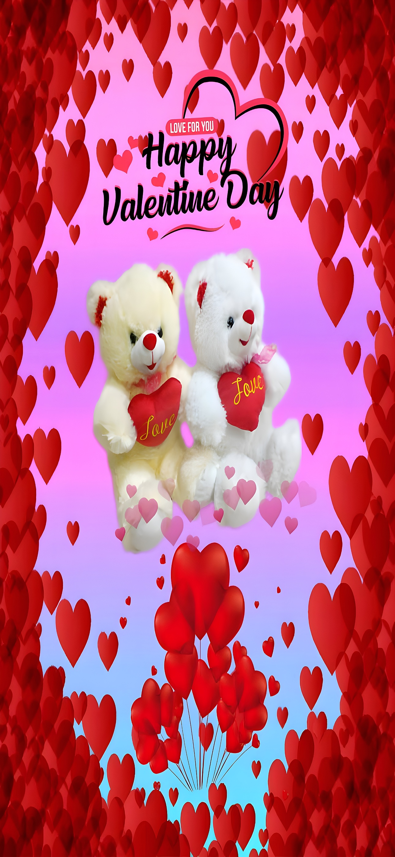 The Valentine Day Love Teddy Bears wallpaper uses a palette of soft pink gradients, bright red hearts, and the creamy and white hues of the teddy bears to evoke feelings of warmth and affection. The artistic style blends realistic plush textures with playful, floating heart shapes and balloons, creating a lively yet tender scene. This romantic wall art is perfect for those seeking high-definition backgrounds that celebrate love, romance, and festive occasions. The vivid reds symbolize passion, while the gentle pink and blue tones add calmness and serenity, making this wallpaper an ideal expression of heartfelt emotions.