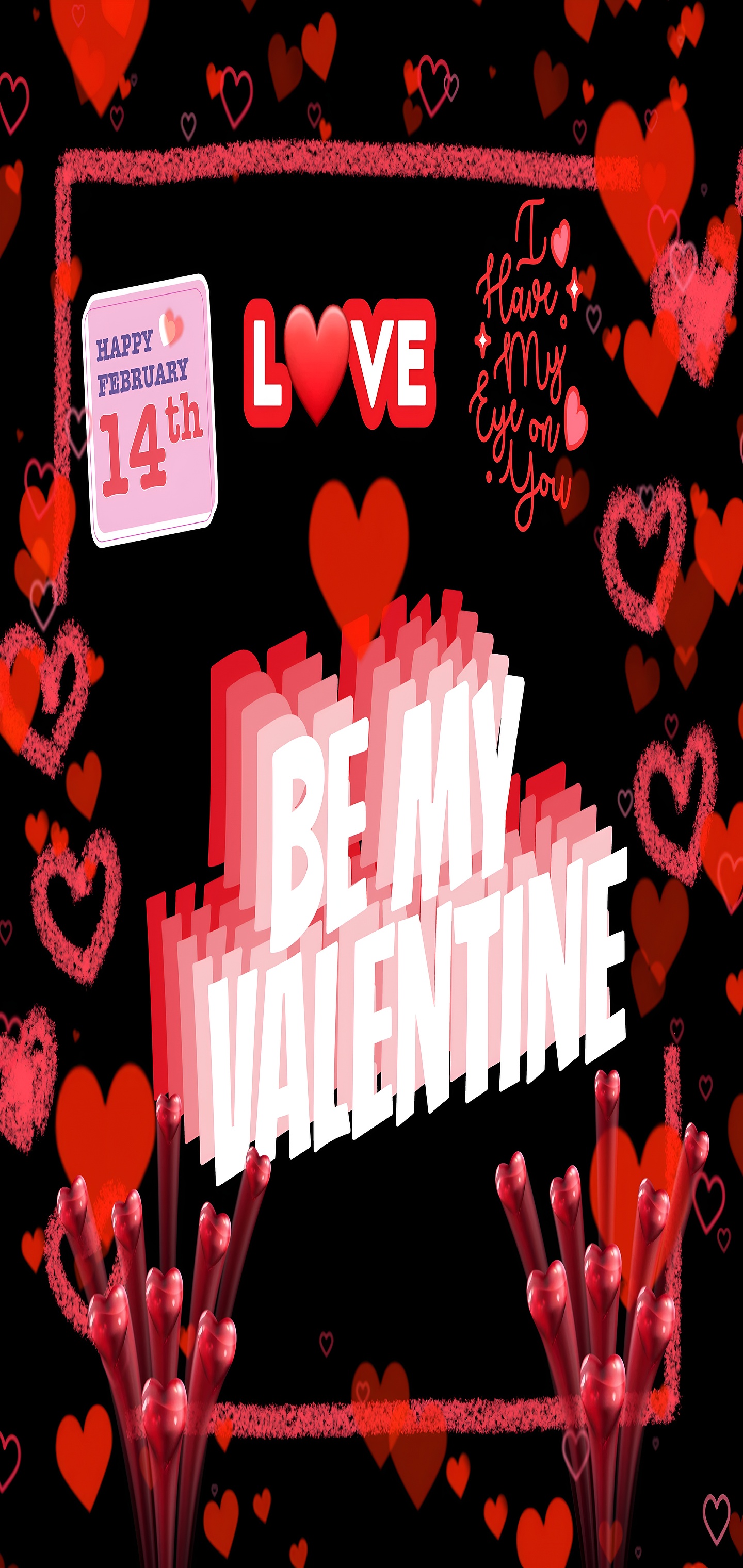 This Be My Valentine Love Art wallpaper captures the essence of romance with a bold and playful design perfect for celebrating February 14th. The main subject is the large, three-dimensional text "BE MY VALENTINE" in white with layered pink shadows, creating a dynamic and eye-catching focal point. Surrounding the text are various heart shapes in vibrant red and soft pink hues, floating against a deep black background that enhances the vivid colors and adds a dramatic contrast. The composition is framed with a textured pink border, giving the design a handcrafted, artistic feel.