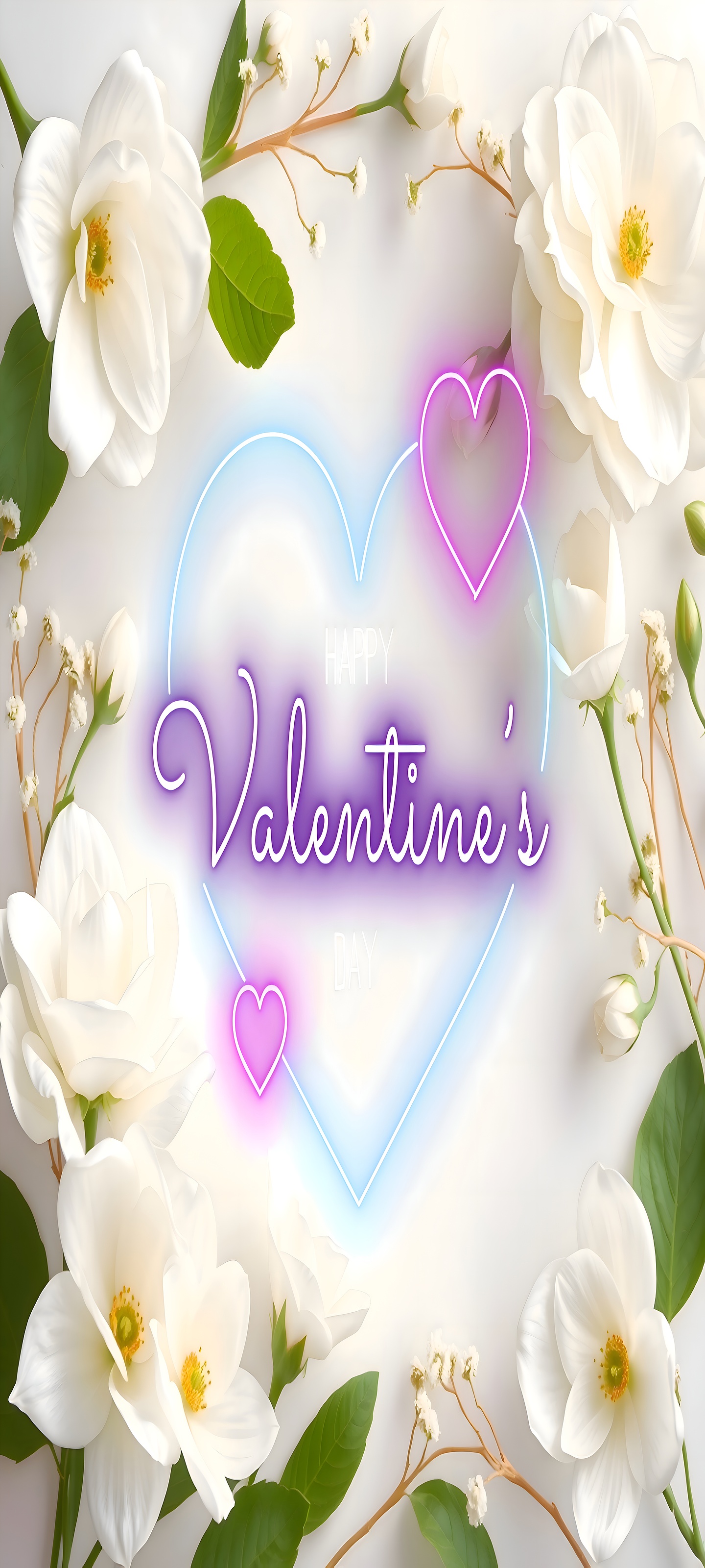 This wallpaper features a harmonious blend of natural and digital artistry. The soft white flowers, including roses and delicate buds, are rendered with lifelike textures and subtle shadows, emphasizing their purity and elegance. The neon heart and script introduce a glowing, futuristic element with pastel purple, neon pink, and blue tones that contrast beautifully with the organic floral shapes. The background is a smooth, light gradient that enhances the brightness of the flowers and neon elements, creating a balanced composition. This romantic floral art is perfect for those seeking a blend of nature-inspired beauty and modern graphic design in their mobile wallpaper or desktop background.