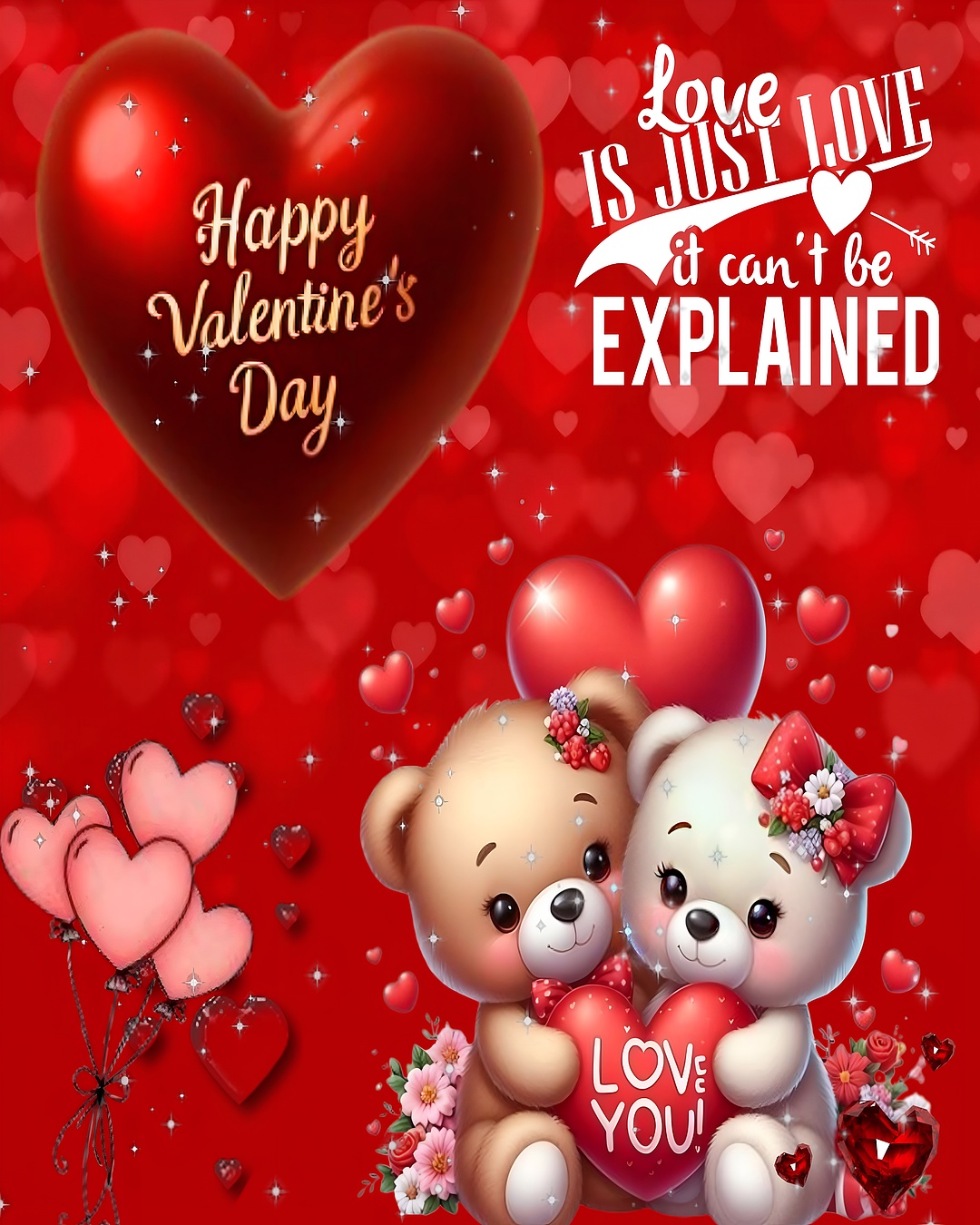 This Valentine's Day Love Bears HD Wallpaper captures the essence of love and affection through an adorable digital illustration featuring two charming teddy bears. The main subjects, a beige and a white teddy bear, are nestled closely together, holding a bright red heart inscribed with "LOVE YOU!" Their sweet expressions and floral accessories add a tender, loving vibe to the composition. Surrounding them are floating heart-shaped balloons and sparkling accents that enhance the romantic atmosphere, making this wallpaper perfect for celebrating love on any device.