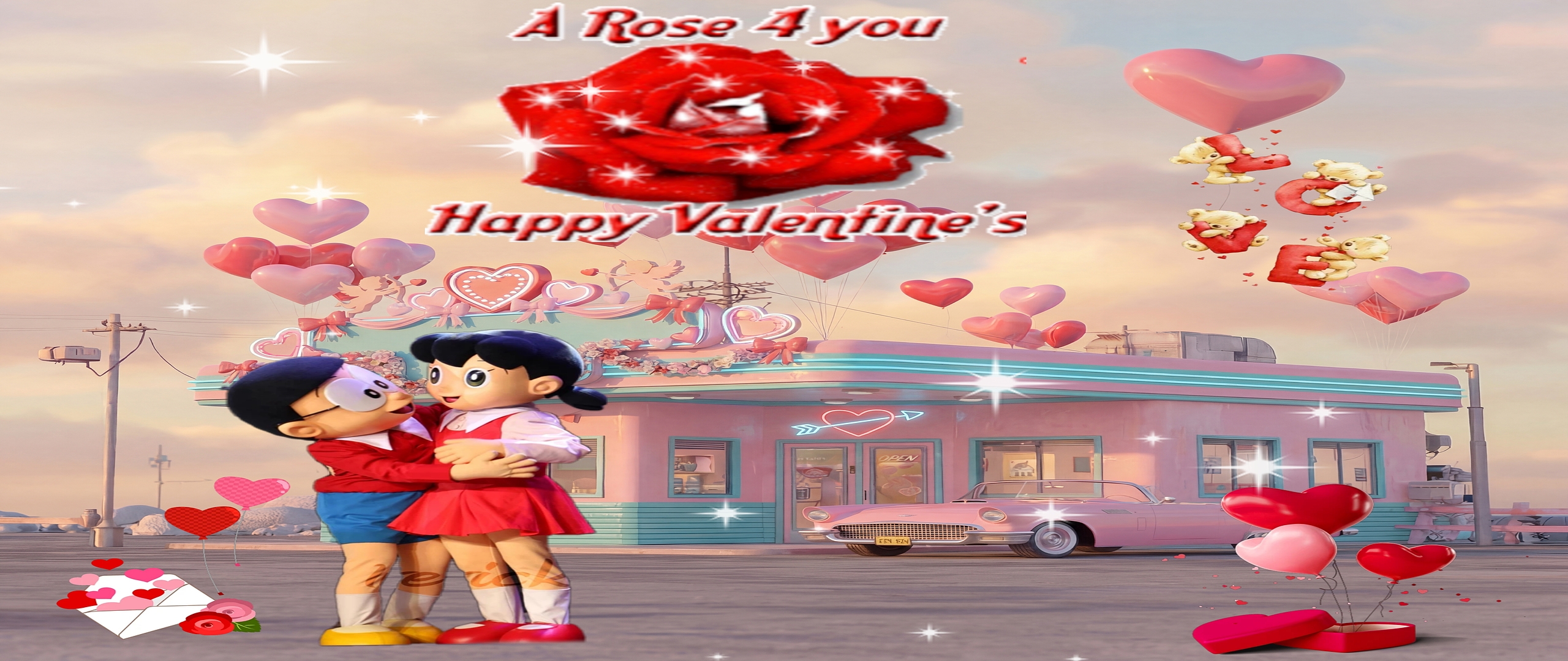 The wallpaper's artistic style combines playful animation with a touch of vintage Americana, highlighted by the pastel blue and pink diner and the classic pink convertible parked nearby. The sparkling stars scattered throughout the image add a magical quality, while the floating teddy bears holding letters spelling "LOVE" and the large red rose with the greeting "A Rose 4 you Happy Valentine's" emphasize the festive and affectionate mood. This high-resolution wallpaper, sized at 3200×3200, offers a perfect blend of nostalgic charm and modern digital art, ideal for lovers of romantic and animated themes.