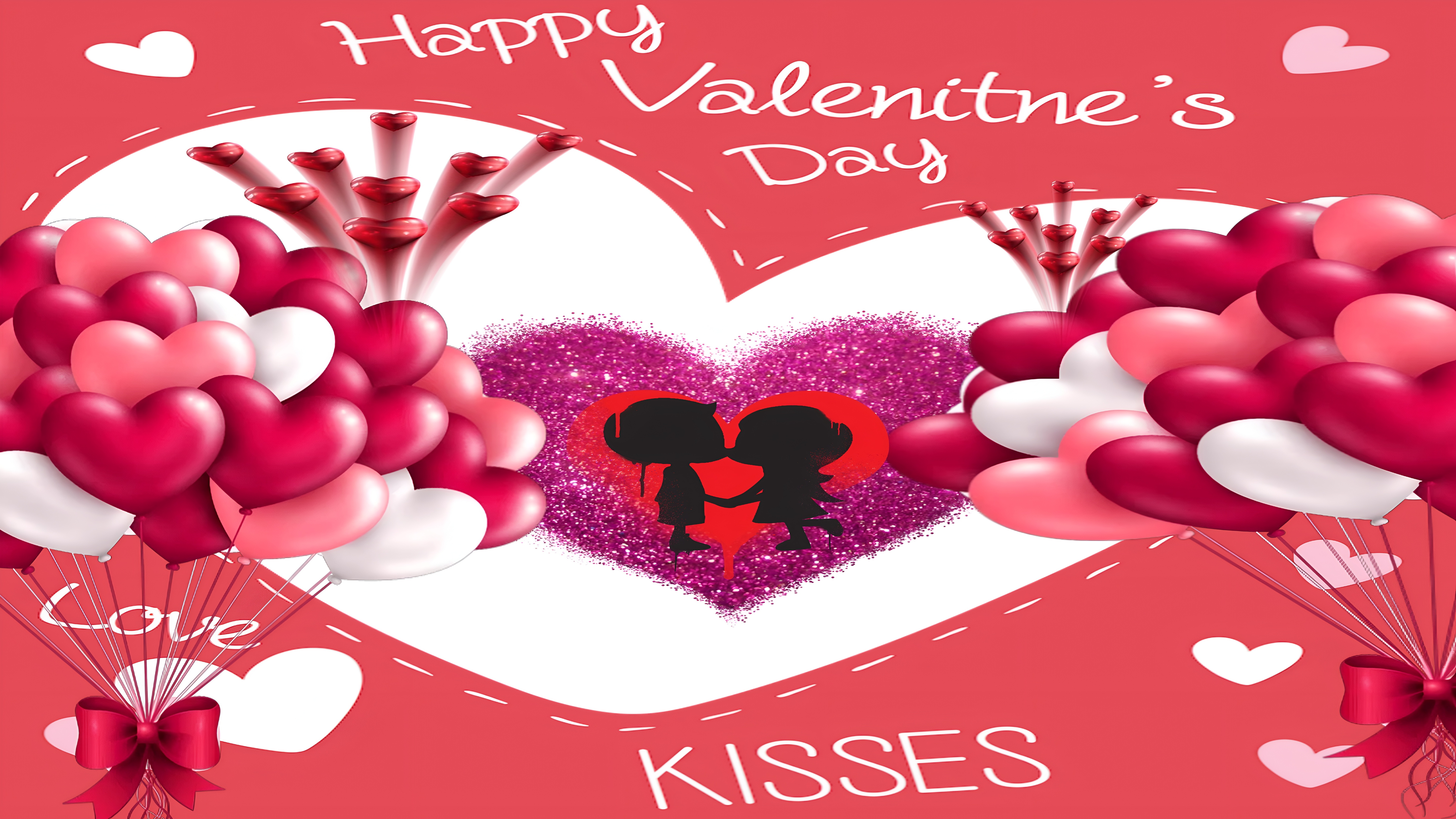 The Valentine's Day Romantic Heart Art wallpaper features a harmonious blend of colors and textures, including the shiny surfaces of the heart-shaped balloons and the sparkling glitter heart centerpiece. The use of silhouette art for the kissing couple adds a timeless and universal symbol of love, while the playful handwritten-style text enhances the casual and joyful mood. This romantic wallpaper is perfect for those seeking a cute couple illustration or love-themed wall art that captures the essence of Valentine's Day. The combination of pink and red hues with white accents creates a balanced and visually soothing effect, making it suitable for various devices and screen sizes.