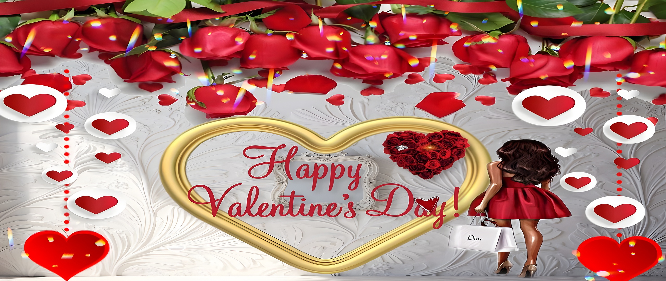 This Valentine's Day Romantic Heart Wallpaper beautifully captures the essence of love and celebration with a stunning arrangement of vibrant red roses hanging from above, creating a lush and passionate canopy. At the center, a large golden heart frame encloses the heartfelt message “Happy Valentine's Day!” written in elegant red script, perfectly blending romance with sophistication. The background features a delicate white embossed floral pattern, adding a soft and luxurious texture that contrasts gracefully with the vivid reds and warm golds. A woman dressed in a flowing red dress stands with her back to the viewer, holding a chic Dior shopping bag, adding a touch of modern luxury and style to the romantic setting.