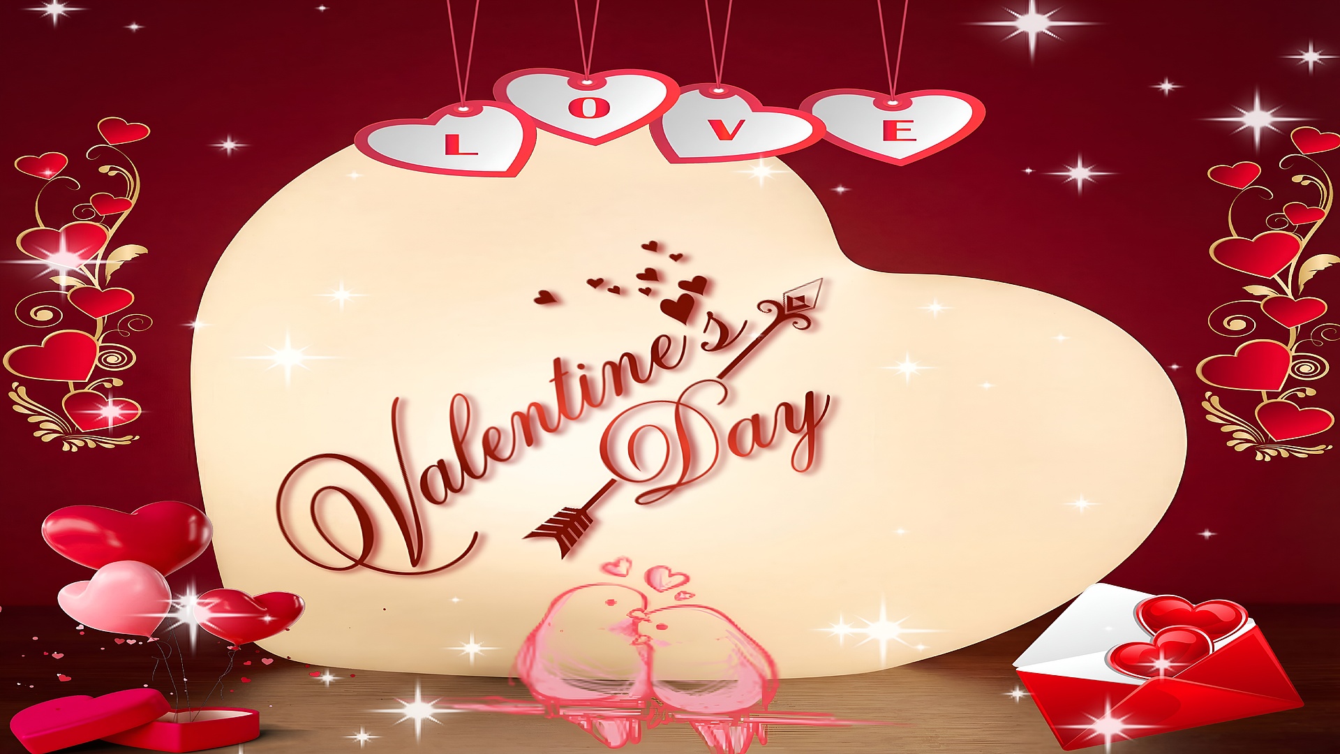The wallpaper features delicate artistic elements such as hanging heart-shaped tags spelling out "LOVE" in bold red letters, and two adorable pink love birds perched closely together, symbolizing affection and togetherness. Additional decorative flourishes include swirling golden vines with red hearts on either side, a cluster of red and pink heart-shaped balloons, and a red envelope filled with hearts, all contributing to the romantic and joyful theme. This high-resolution wallpaper blends soft textures with bright highlights, making it ideal for anyone looking to infuse their screen with love and celebration.