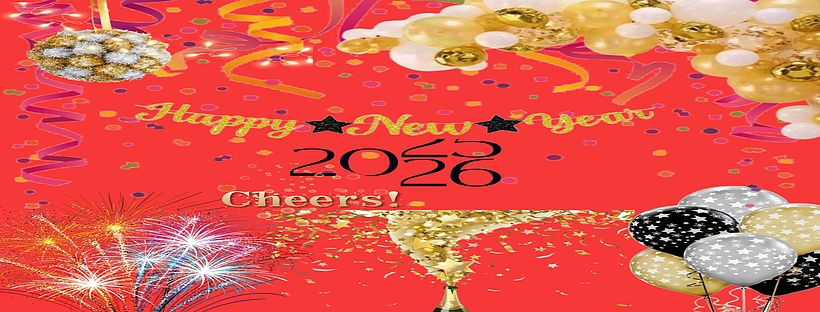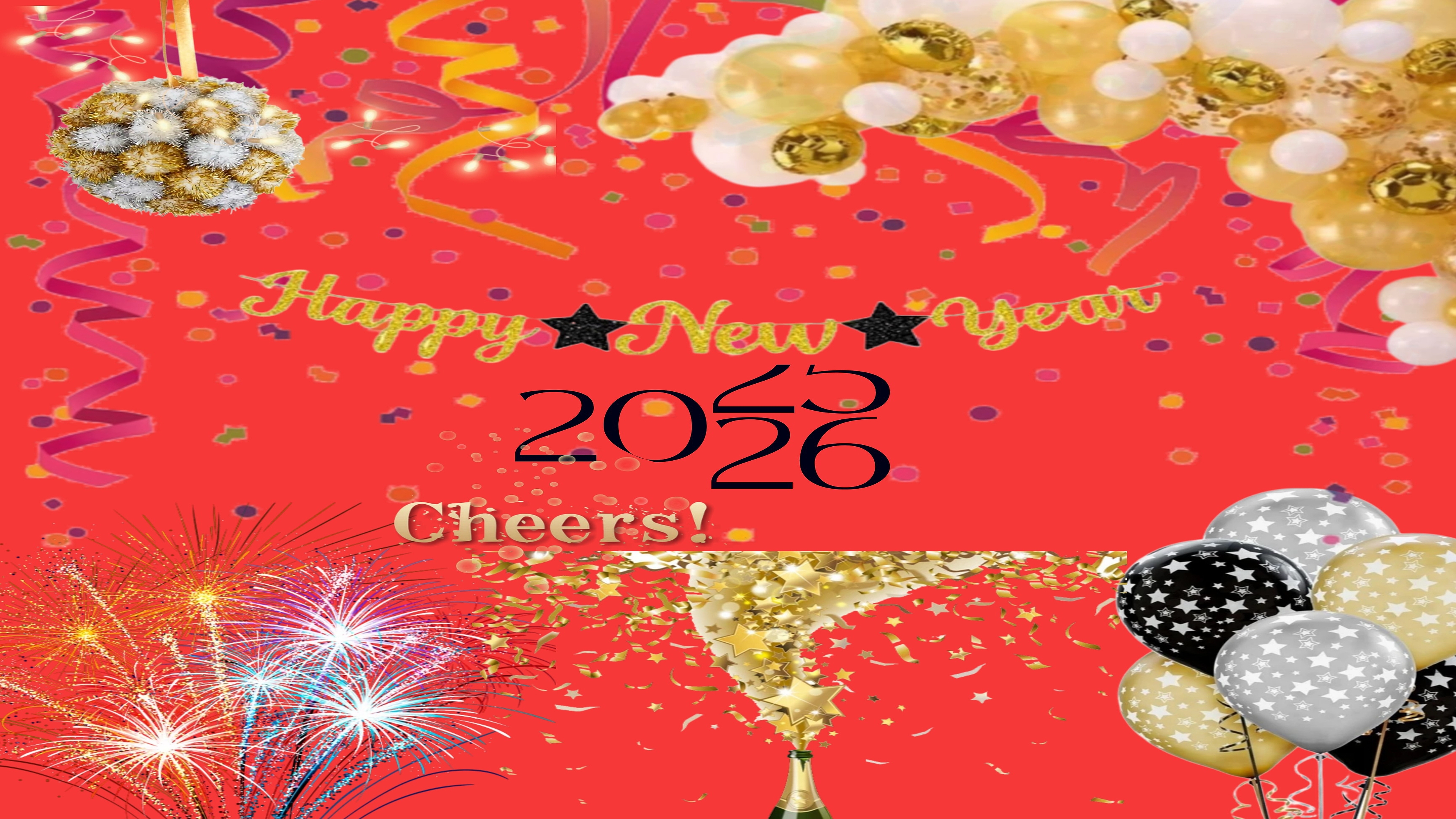 Celebrate the arrival of 2026 with our vibrant New Year celebration wallpaper that encapsulates the joy and excitement of the festive season. This stunning HD wallpaper features a lively red backdrop adorned with golden accents, black highlights, and cheerful decorations, creating an atmosphere of celebration and hope. The design includes festive elements like balloons, confetti, and sparkling fireworks, making it perfect for anyone looking to add a touch of joy to their digital space.