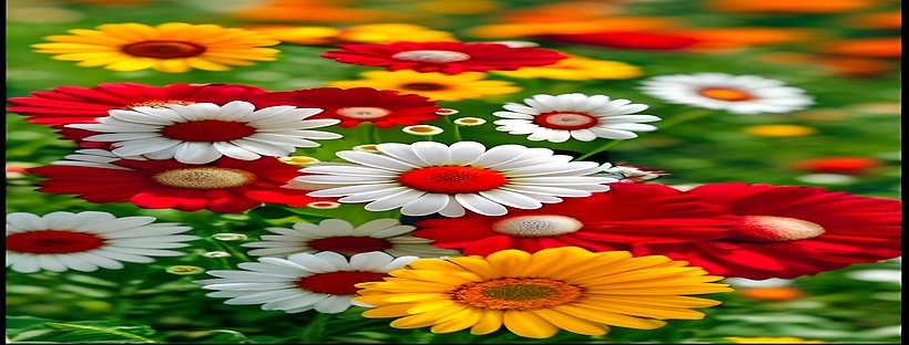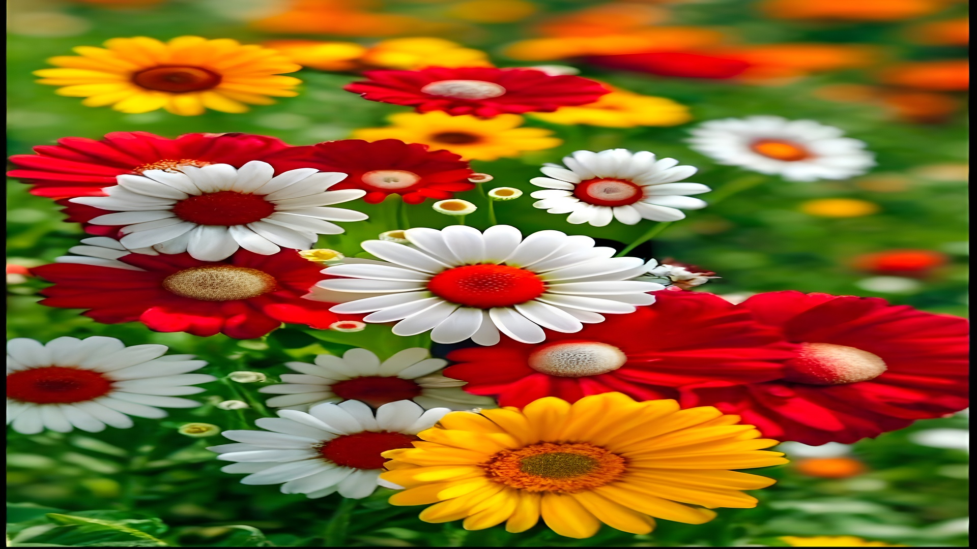 This HD wallpaper captures the bright and cheerful charm of multicolored daisies in a blooming garden. With petals in bold shades of red, white, and golden yellow, the flowers stand out beautifully against the lush green background. The vivid hues create a refreshing and joyful mood, perfect for brightening up any screen. Ideal for nature lovers, this wallpaper brings the essence of spring and positivity, making it a delightful choice for daily inspiration.