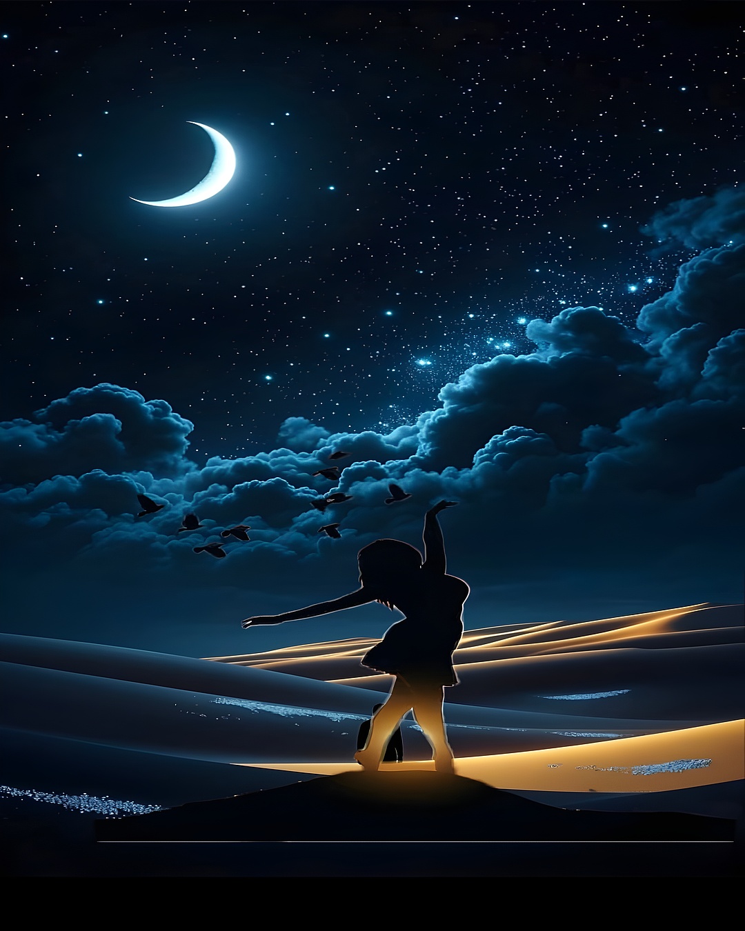 Dancing girl moonlight HD wallpaper captures a dreamlike moment beneath a starlit sky, where a silhouetted girl dances gracefully atop a glowing hill. Her pose, full of freedom and joy, is framed by golden light trails that ripple across the landscape like streams of magic. Above her, a crescent moon glows softly, surrounded by dramatic clouds and a flurry of stars, while birds soar through the night, adding motion to the serenity.