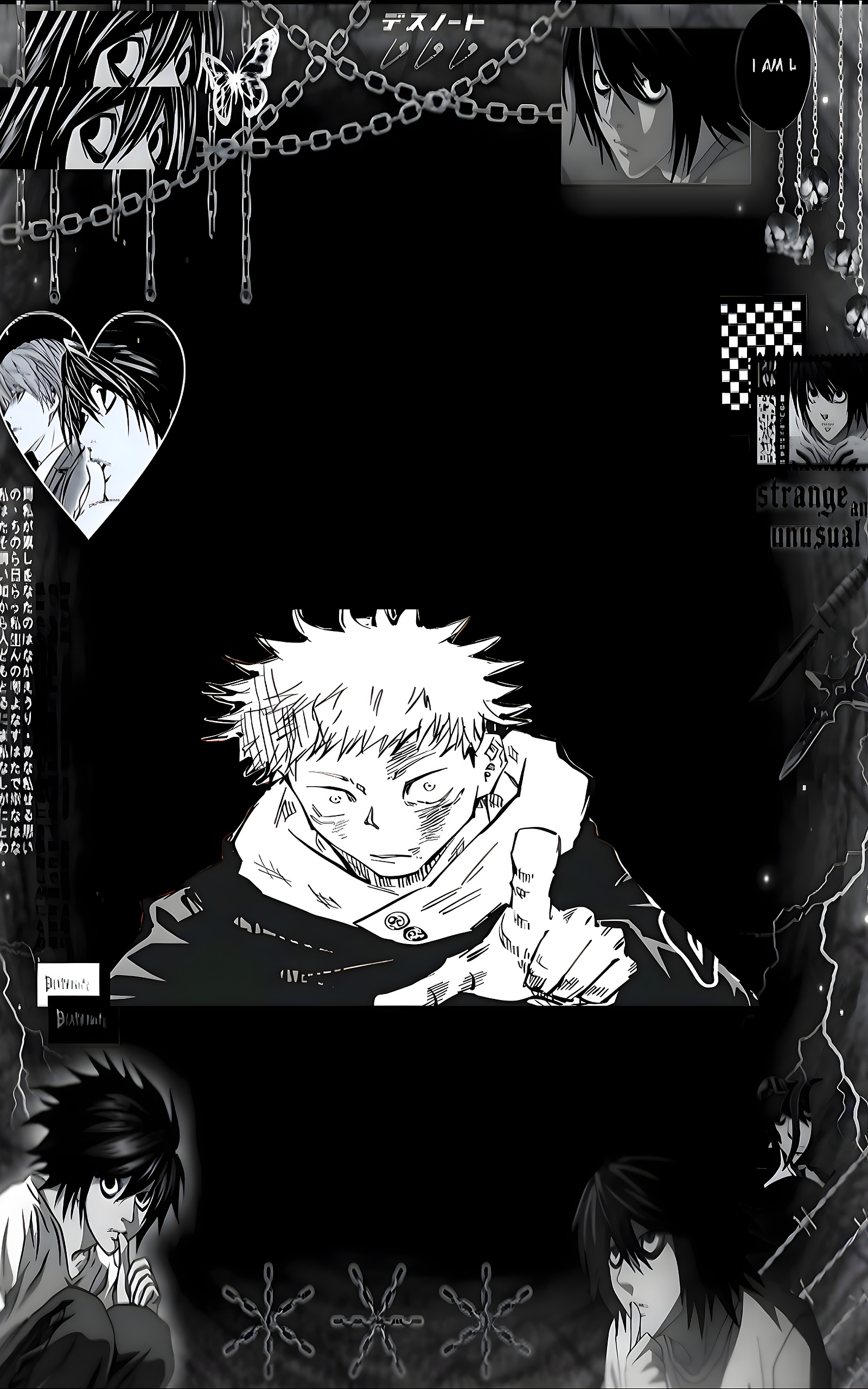 Death note jujutsu collage this HD wallpaper blends the enigmatic aura of Death Note with the raw energy of Jujutsu Kaisen, creating a visually intense anime crossover. Yuji Itadori stands boldly at the center in monochrome manga style, surrounded by multiple expressions of L—each capturing his iconic intellect and eerie calm. The background is layered with chains, butterflies, skulls, and lightning, amplifying the dramatic tension. Japanese text and phrases like “I AM L” and “strange and unusual” add depth and intrigue. Perfect for fans who appreciate psychological thrillers and supernatural battles, this wallpaper delivers a high-contrast, stylized aesthetic that’s ideal for mobile screens.