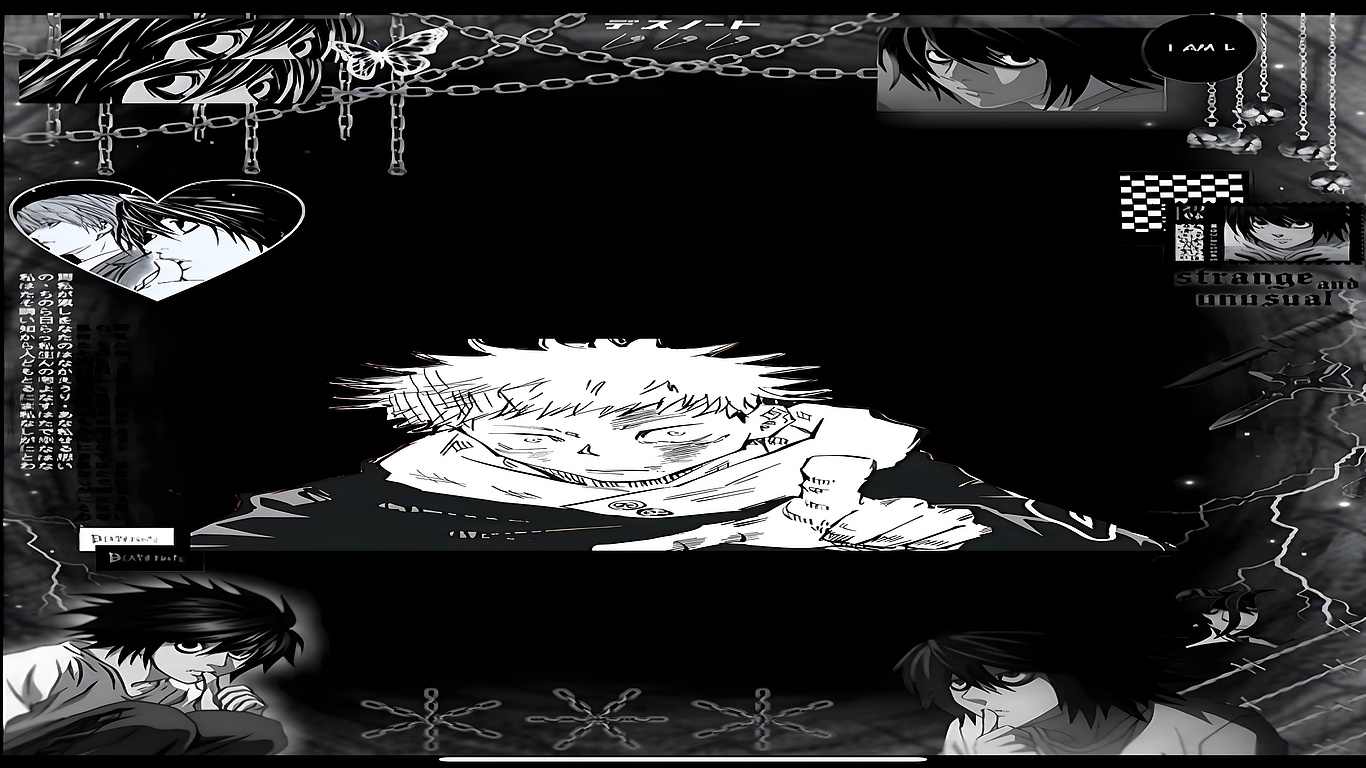 This HD wallpaper blends the enigmatic charm of Death Note with the raw intensity of Jujutsu Kaisen, creating a visually striking collage perfect for anime enthusiasts. At the center stands Yuji Itadori in monochrome, his serious gaze and pointed gesture radiating determination. Surrounding him are multiple expressive portraits of L, the iconic detective from Death Note, adding layers of mystery and intellect.