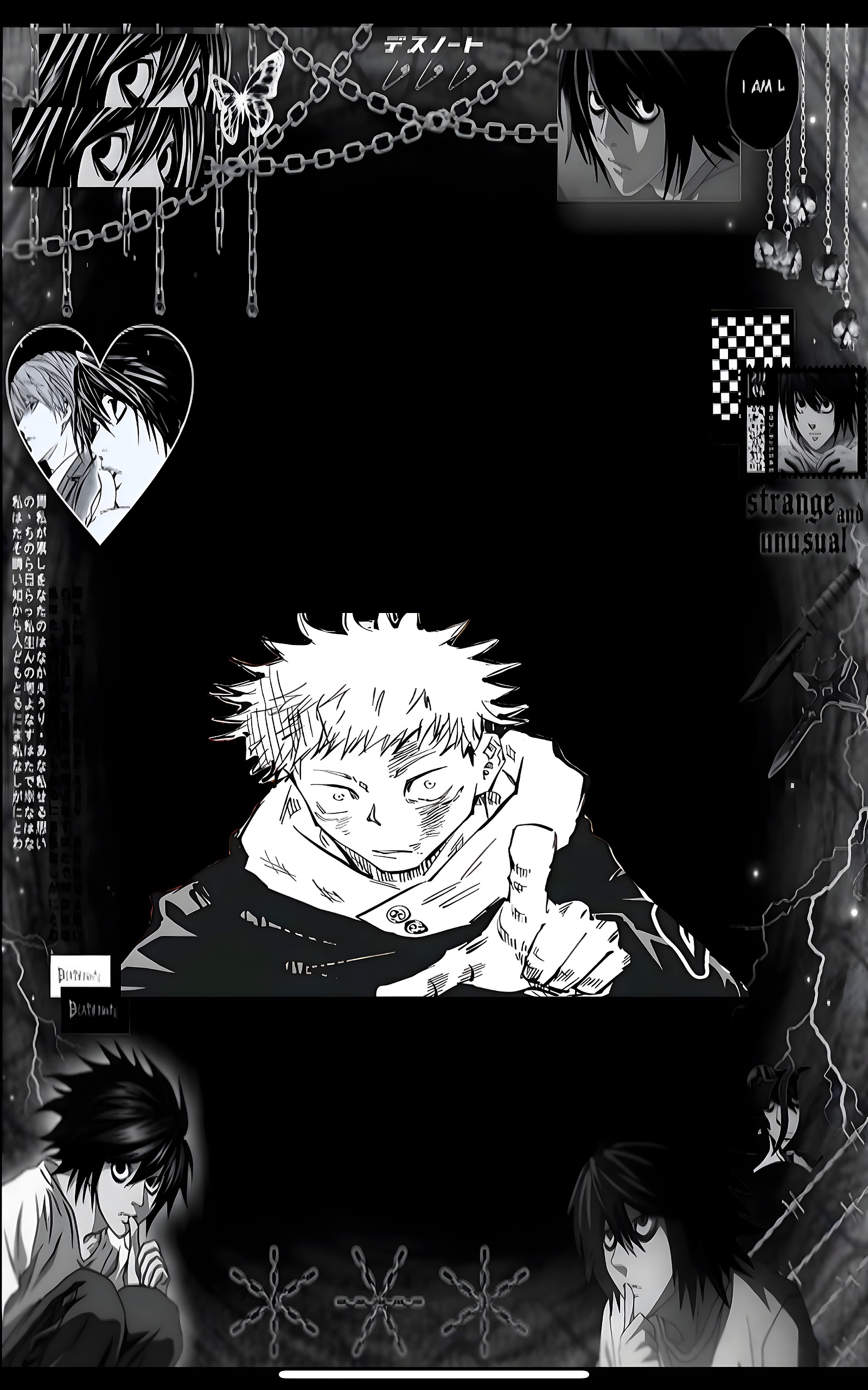 The background is rich with gothic motifs—chains, hearts, stars, and dark textures—that amplify the dramatic tone. Japanese text and phrases like “I AM L” and “strange and unusual” enhance the thematic depth, making this wallpaper not just a visual treat but a narrative piece.