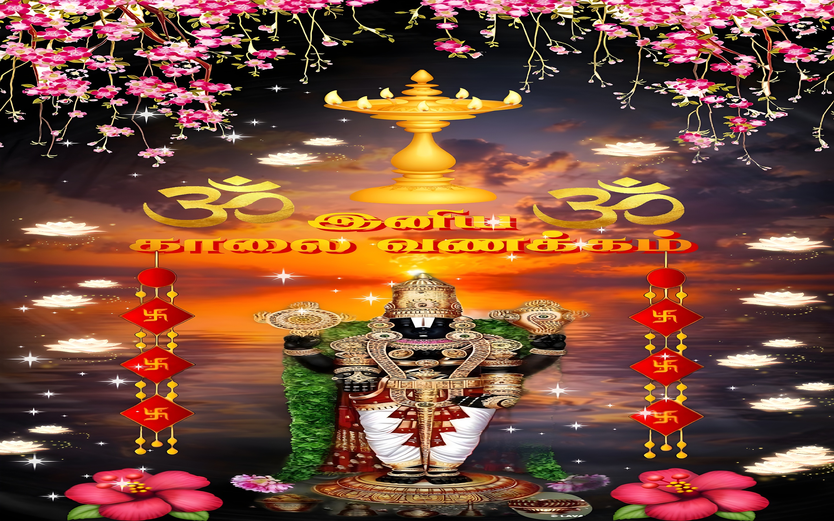 This high-resolution wallpaper showcases a harmonious blend of colors and symbols that enrich its spiritual theme. The golden yellow of the lamp and ornaments symbolizes divinity and enlightenment, while the deep black of Lord Venkateswara’s figure represents strength and mystery. Vibrant pink flowers hanging from above and placed at the bottom corners add a lively, celebratory touch, balancing the warm orange and purple tones of the sunset background. The inclusion of sacred symbols such as the Om signs and traditional swastikas enhances the devotional significance of the image. The detailed textures of the jewelry and floral elements, combined with the soft glow of the lamp and floating lotuses, create a visually immersive experience that works beautifully as a devotional desktop background or mobile wallpaper.