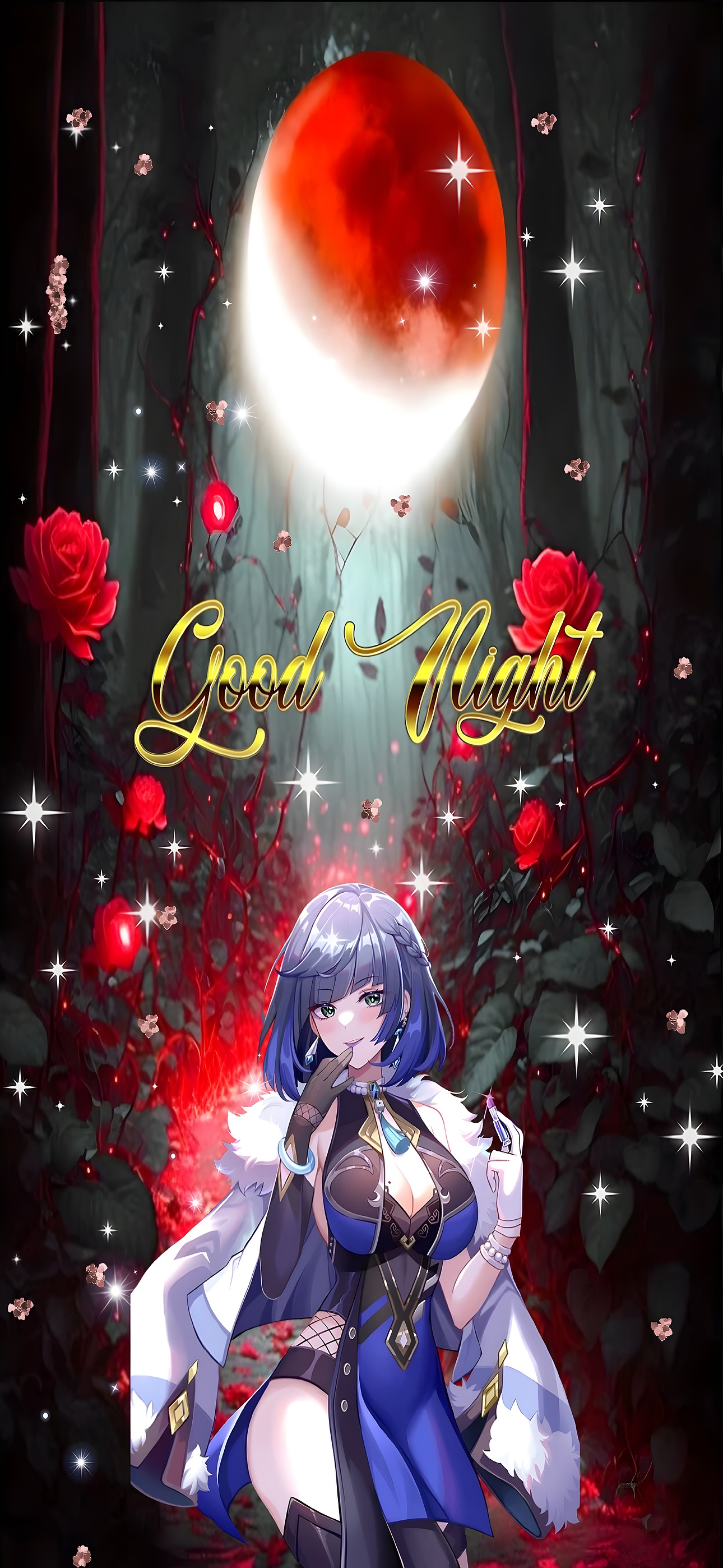 The wallpaper’s palette is rich with deep reds, midnight blues, soft whites, and shimmering golds, creating a visually striking contrast that draws the eye. The dark forest setting, with shadowy foliage and glowing red vines, adds depth and texture, making this piece perfect for fans of fantasy and anime art. The "Good Night" text in elegant gold script adds a warm, inviting touch, making this wallpaper ideal for nighttime device backgrounds or relaxing desktop displays.
