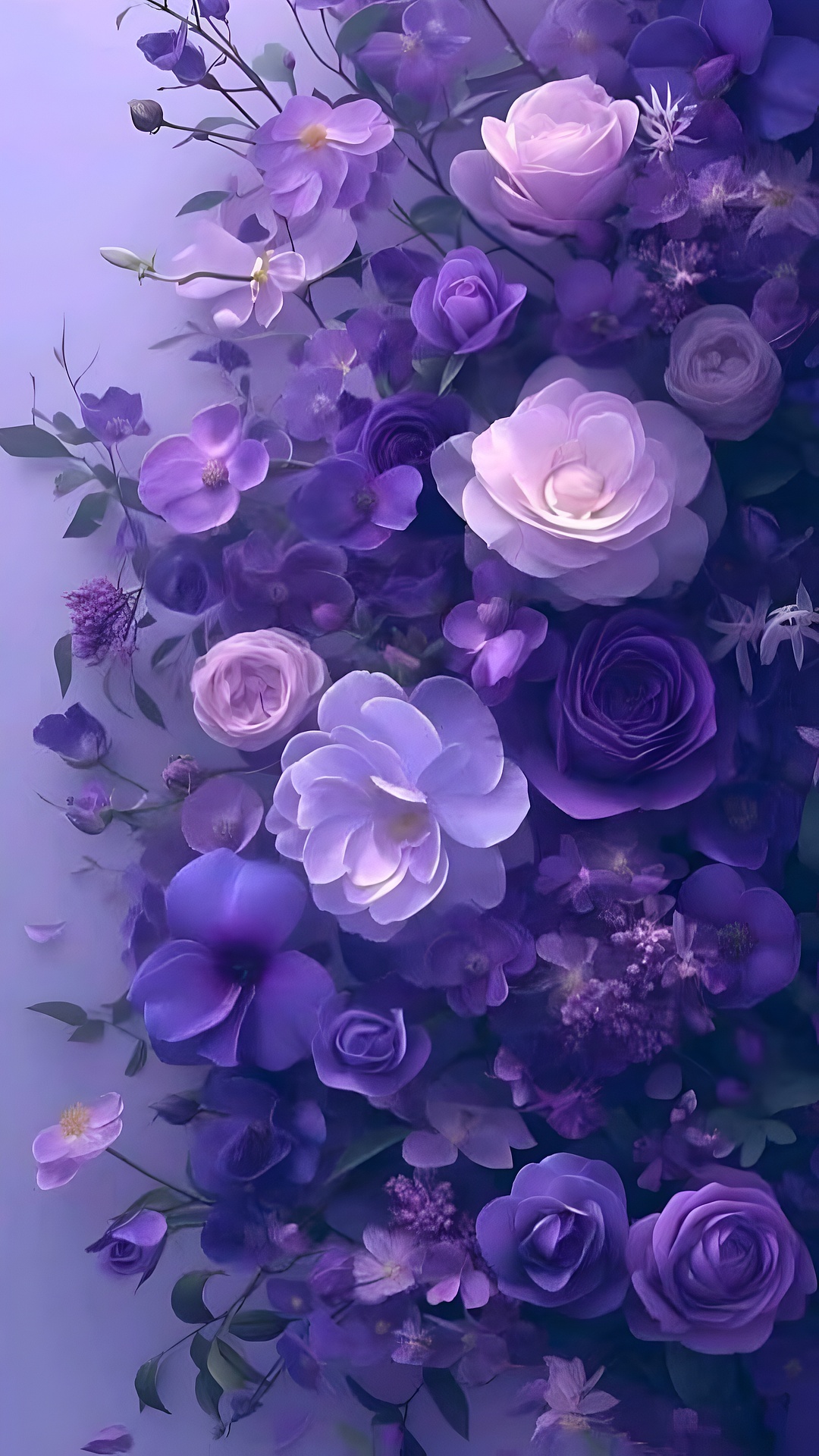 This stunning image showcases a beautiful array of purple flowers blending harmoniously in a dreamy floral arrangement. With soft lavender, violet, and deep purple roses, combined with delicate petals of violets and other blooms, this piece captures nature’s elegance. The varying shades of purple add a serene and calming atmosphere, making it an ideal HD wallpaper for those seeking a peaceful and artistic touch.
