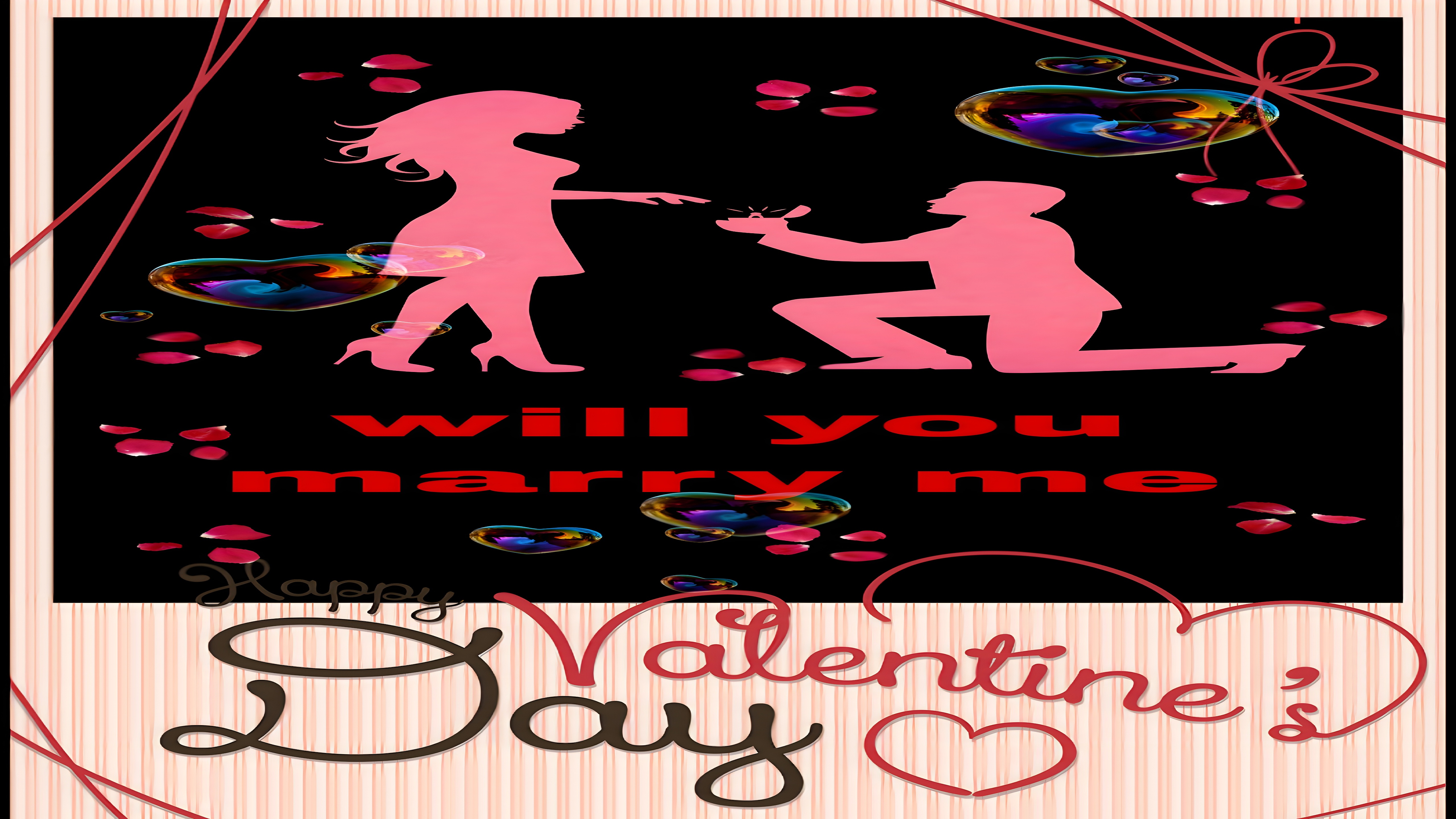 This Romantic Proposal Valentine's Day Wallpaper captures a tender moment of love and commitment in a beautifully stylized silhouette design. The image features a man kneeling with an engagement ring, proposing to a woman standing gracefully in heels, both rendered in soft pink tones that contrast strikingly against a deep black background. Scattered rose petals and iridescent heart-shaped bubbles float around the couple, adding a whimsical and dreamy atmosphere to this romantic scene. The phrase "will you marry me" appears boldly in deep red, emphasizing the heartfelt question that defines this intimate moment. Below, a warm greeting reads "Happy Valentine's Day" in elegant, flowing script, framed by delicate red ribbons and hearts, enhancing the festive and loving mood.