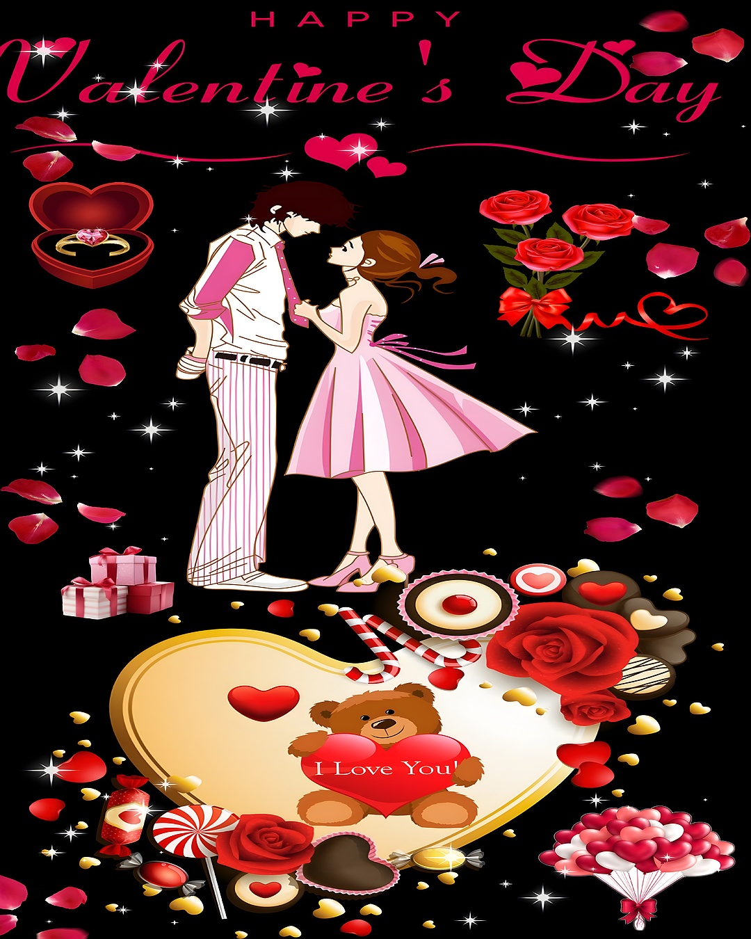Surrounding the couple are classic symbols of Valentine's Day, including a bouquet of vibrant red roses tied with a red bow, heart-shaped chocolates, candy canes, and a cute teddy bear holding a red heart inscribed with "I Love You." The composition is set against a deep black background that enhances the vivid reds, pinks, and golden beige tones, creating a striking contrast that draws the eye. Sparkling star-like highlights scattered throughout add a magical, celebratory atmosphere, perfect for evoking the spirit of love and devotion.