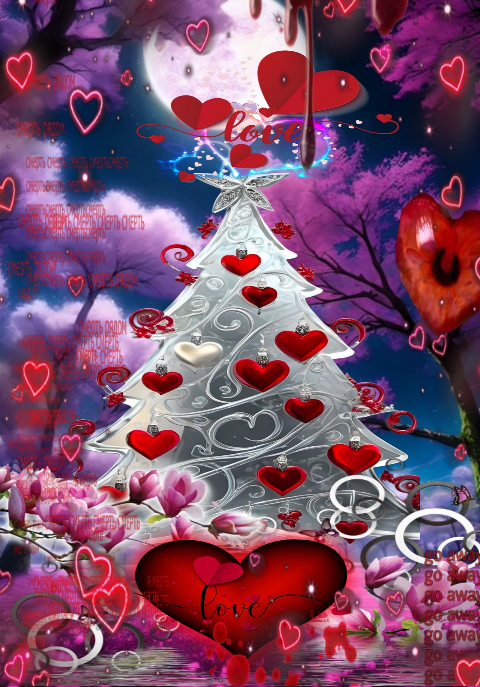 This enchanting HD wallpaper features a stylized silver Christmas tree adorned with glowing red heart ornaments, set against a dreamy nightscape. A full moon casts a soft glow over pink and purple trees, while floating heart shapes and lotus flowers add layers of romantic fantasy. The reflective water surface enhances the magical ambiance, making this artwork a perfect blend of holiday charm and love-themed elegance. Ideal for those who adore romantic visuals with a touch of surreal beauty, this wallpaper brings warmth and whimsy to your screen.