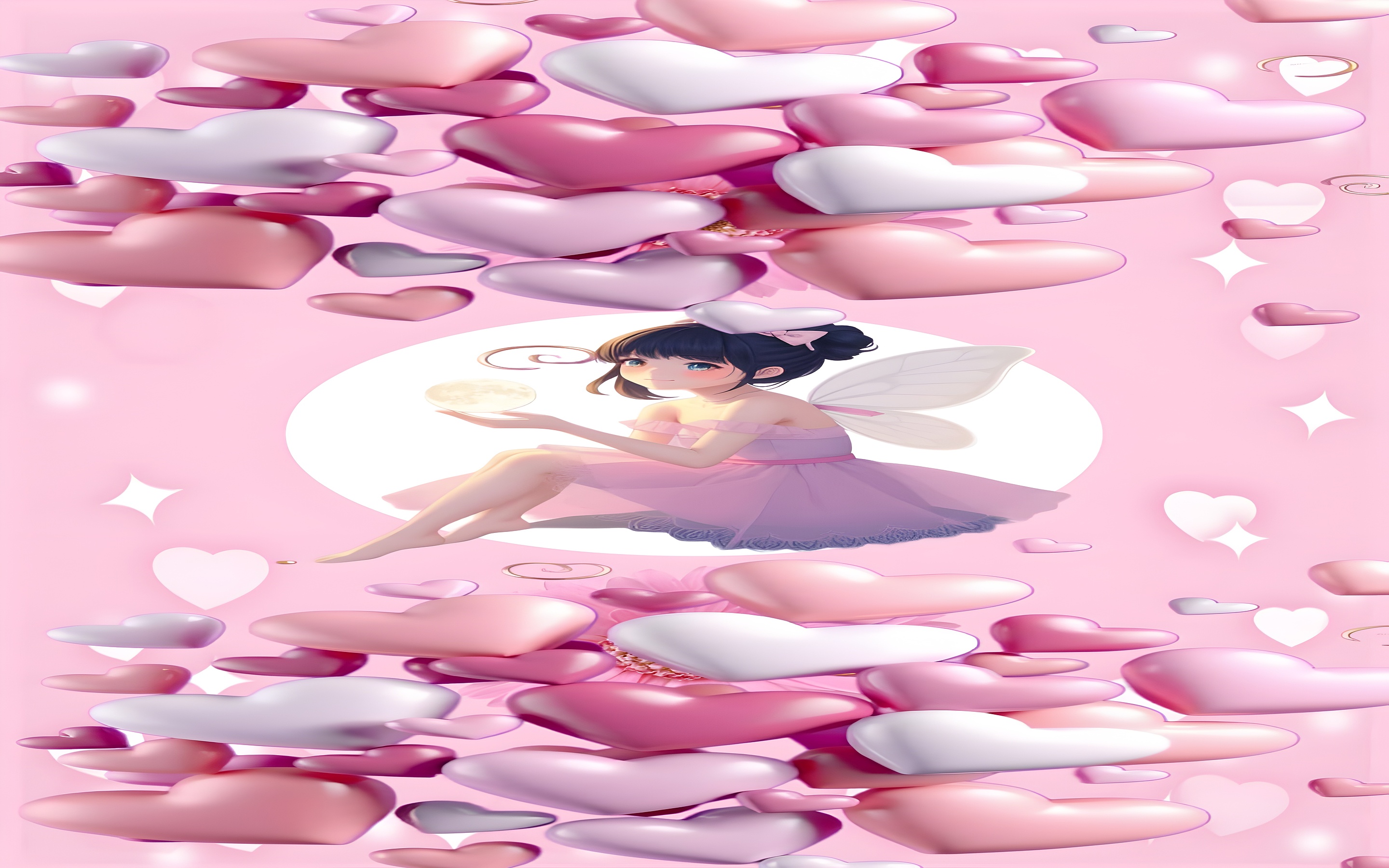 Whimsical Fairy Hearts Immerse yourself in a magical moment with this HD wallpaper featuring a whimsical fairy-like character surrounded by floating pastel hearts. Set against a soft pink backdrop, the central figure—a dark-haired fairy in a lavender dress—sits gracefully within a glowing circular frame, clutching a radiant orb. Her delicate wings and serene expression evoke a sense of wonder and tranquility.