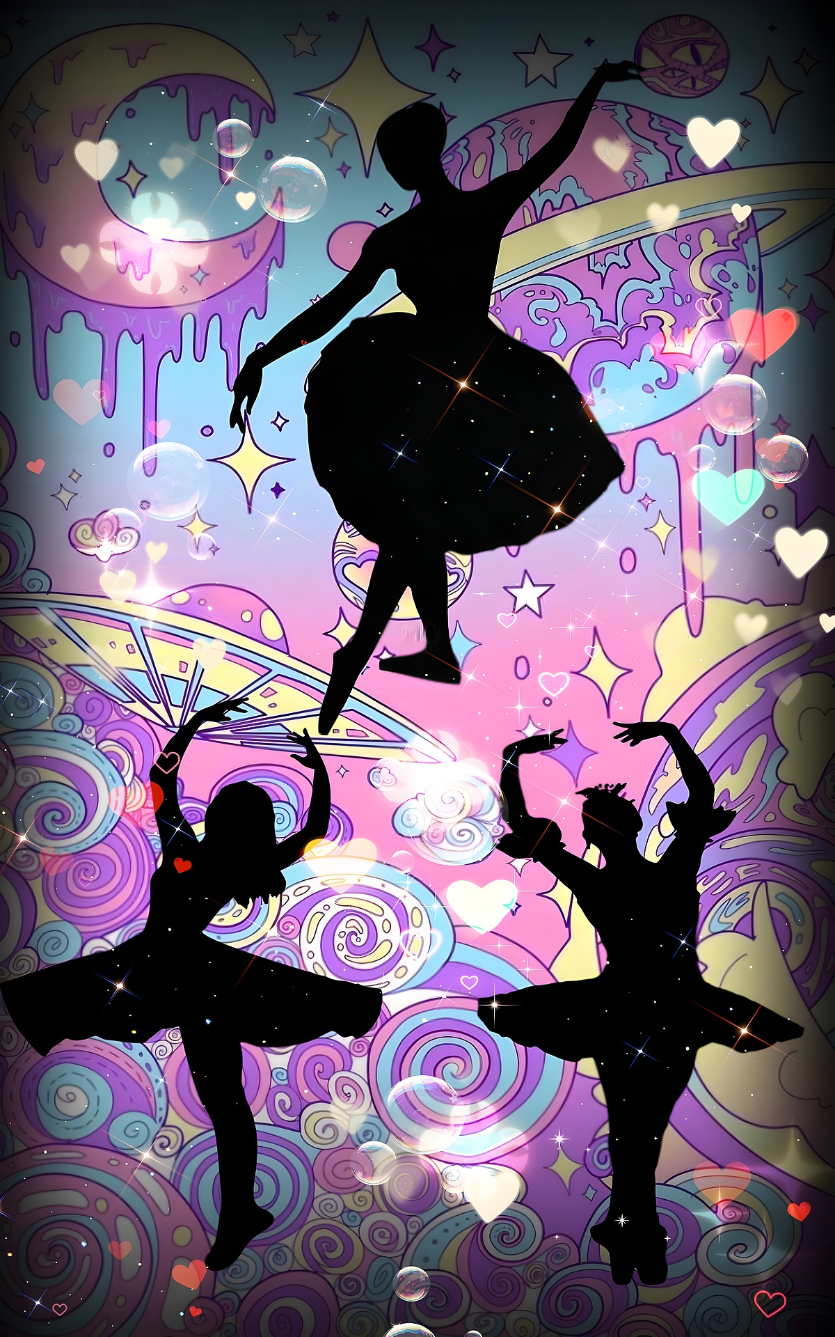 This high-resolution wallpaper, with an impressive resolution of 4320×7416, is designed to elevate your devices. Whether you're looking to enhance your desktop background or find the perfect mobile wallpaper, this piece adapts beautifully to various screen sizes. The artistic style, characterized by its playful and dreamy elements, makes it a captivating addition to any collection of wall art. The silhouettes of the dancers convey elegance and grace, inviting viewers to appreciate the beauty of ballet.