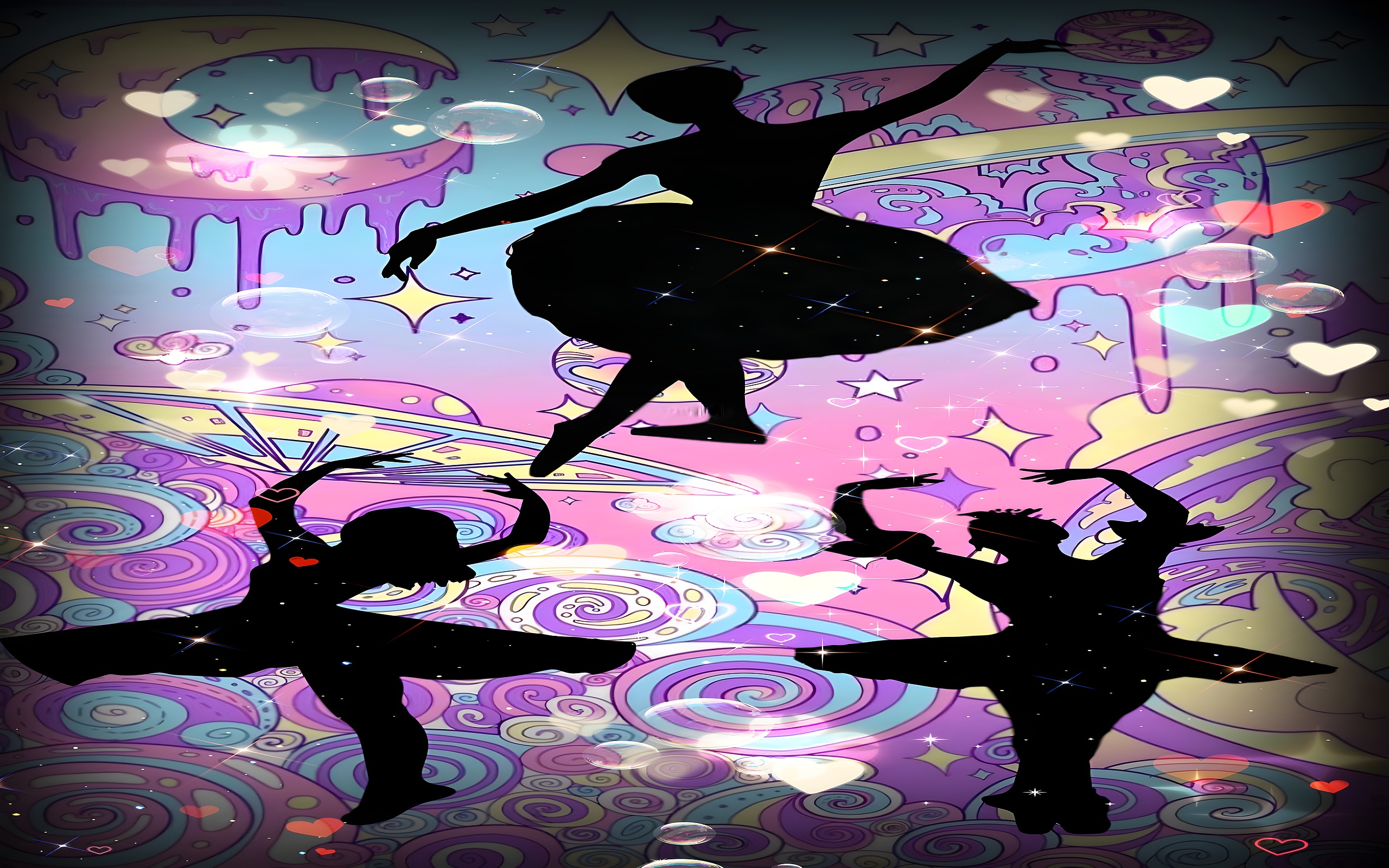 Immerse yourself in the enchanting world of dance with this stunning Ballet Dancers Silhouette HD Wallpaper. Featuring graceful silhouettes of ballet dancers against a vibrant backdrop, this artwork captures the essence of movement and artistry. The colorful background, adorned with swirling patterns and sparkling elements, creates a whimsical atmosphere that is perfect for any dance enthusiast or art lover. The dominant colors of vibrant pink, deep purple, and bright blue blend harmoniously, evoking a sense of joy and creativity, making it an ideal choice for your digital space.
