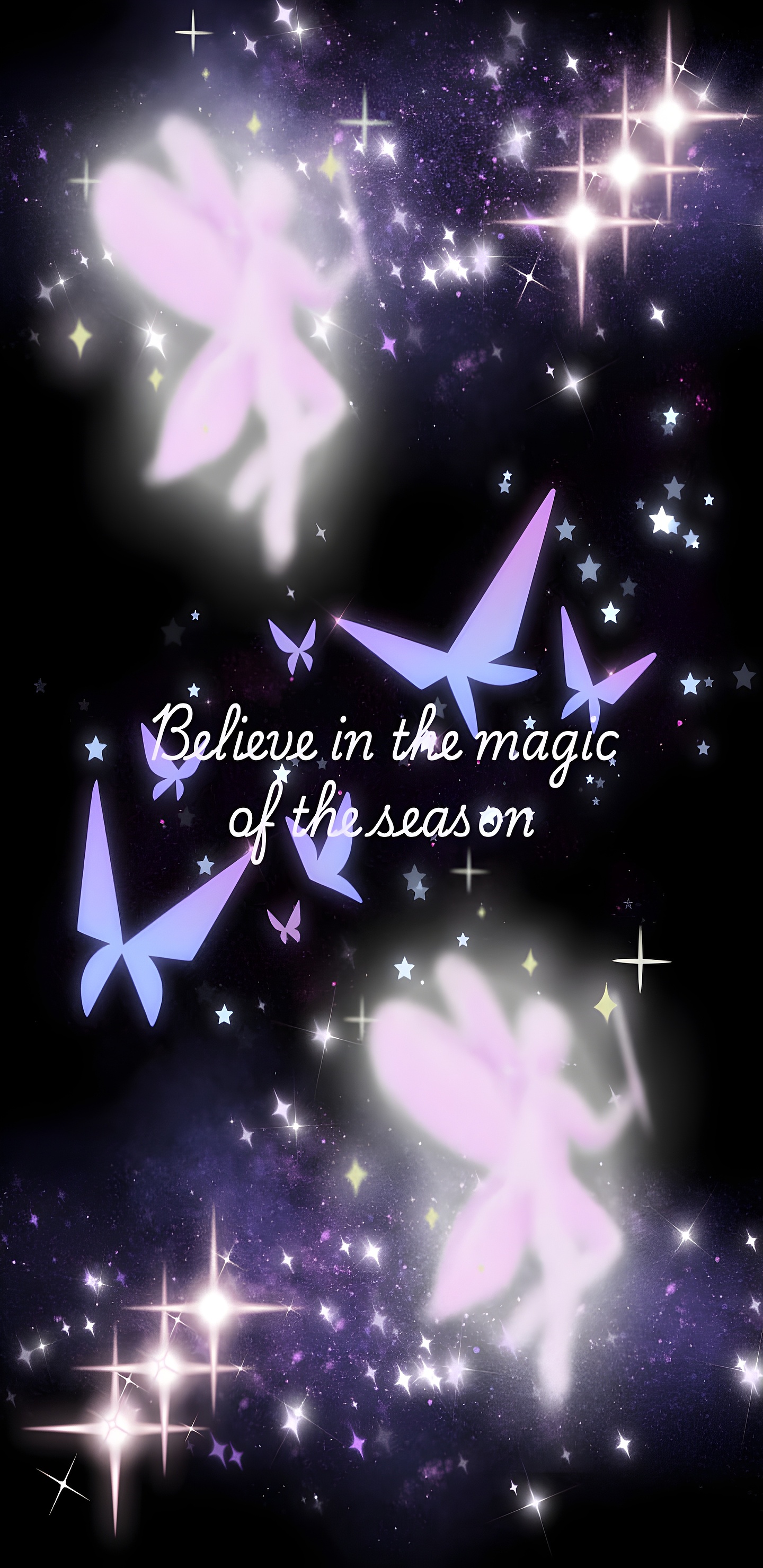 Believe Magic season HD wallpaper featuring glowing fairies and butterflies dancing across a starry, violet-blue sky. The ethereal figures shimmer with soft, radiant light, surrounded by sparkling stars and magical dust trails that evoke the spirit of wonder and enchantment. Perfect for those who love fantasy themes, this artwork captures the essence of seasonal magic with its gentle hues and mystical atmosphere. Whether you’re celebrating winter holidays or simply drawn to the beauty of the unseen, this wallpaper brings a sense of serenity and imagination to your screen.