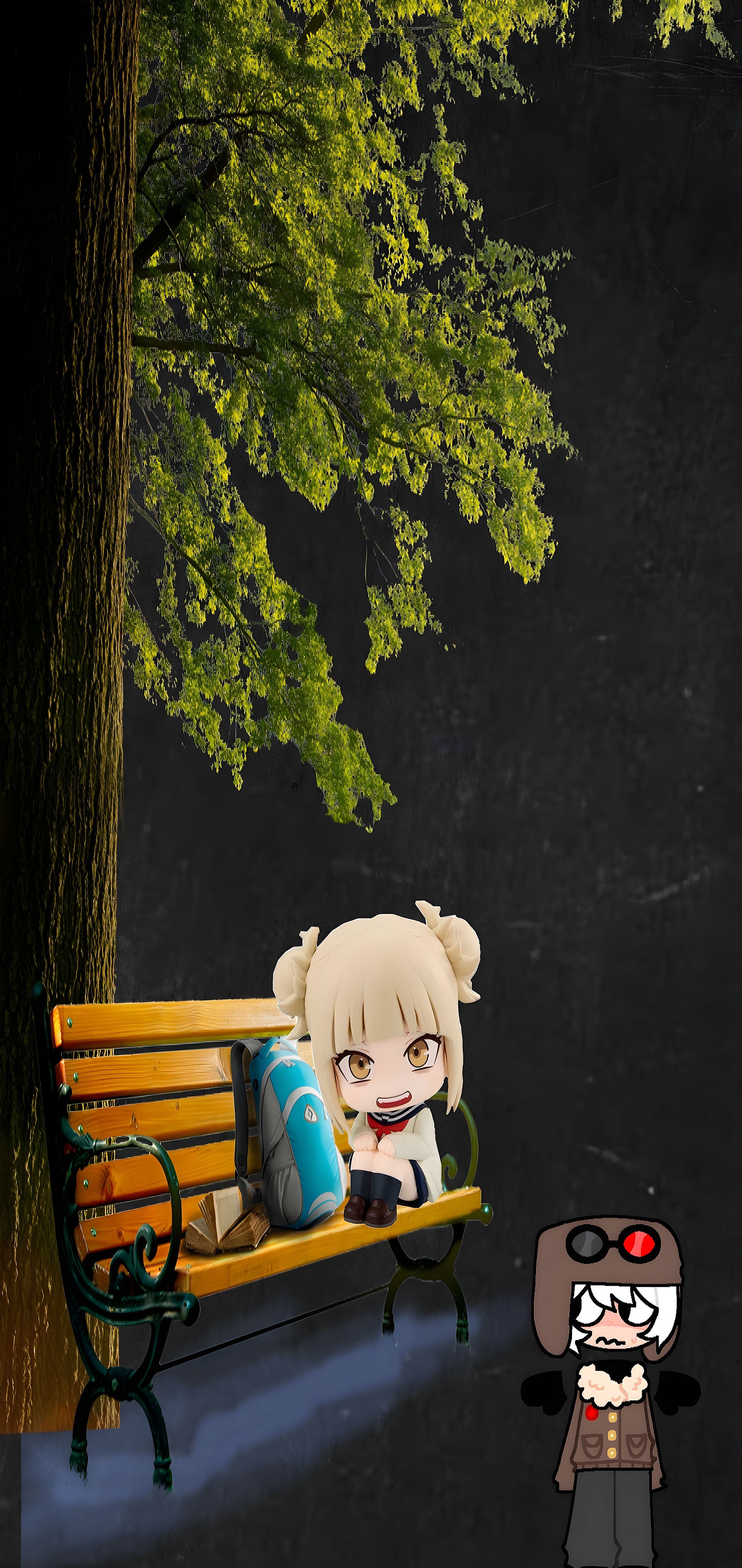 Chibi Park HD wallpaper captures a charming chibi-style scene set in a dimly lit park. A wooden bench with green and yellow slats sits beneath a lush tree, glowing warmly against the dark backdrop. On the bench, a mischievous character with twin buns and a dark outfit smiles playfully, accompanied by