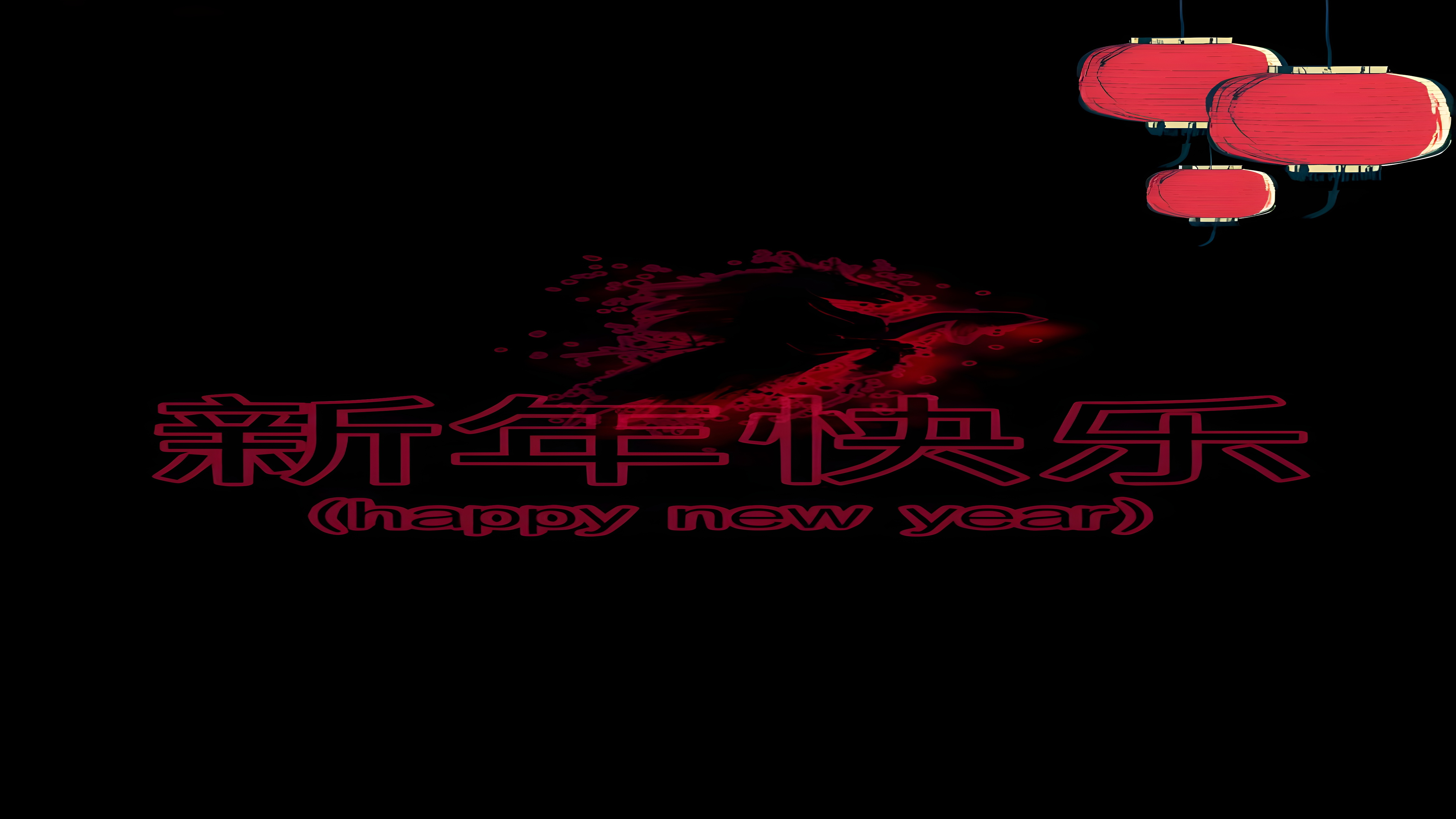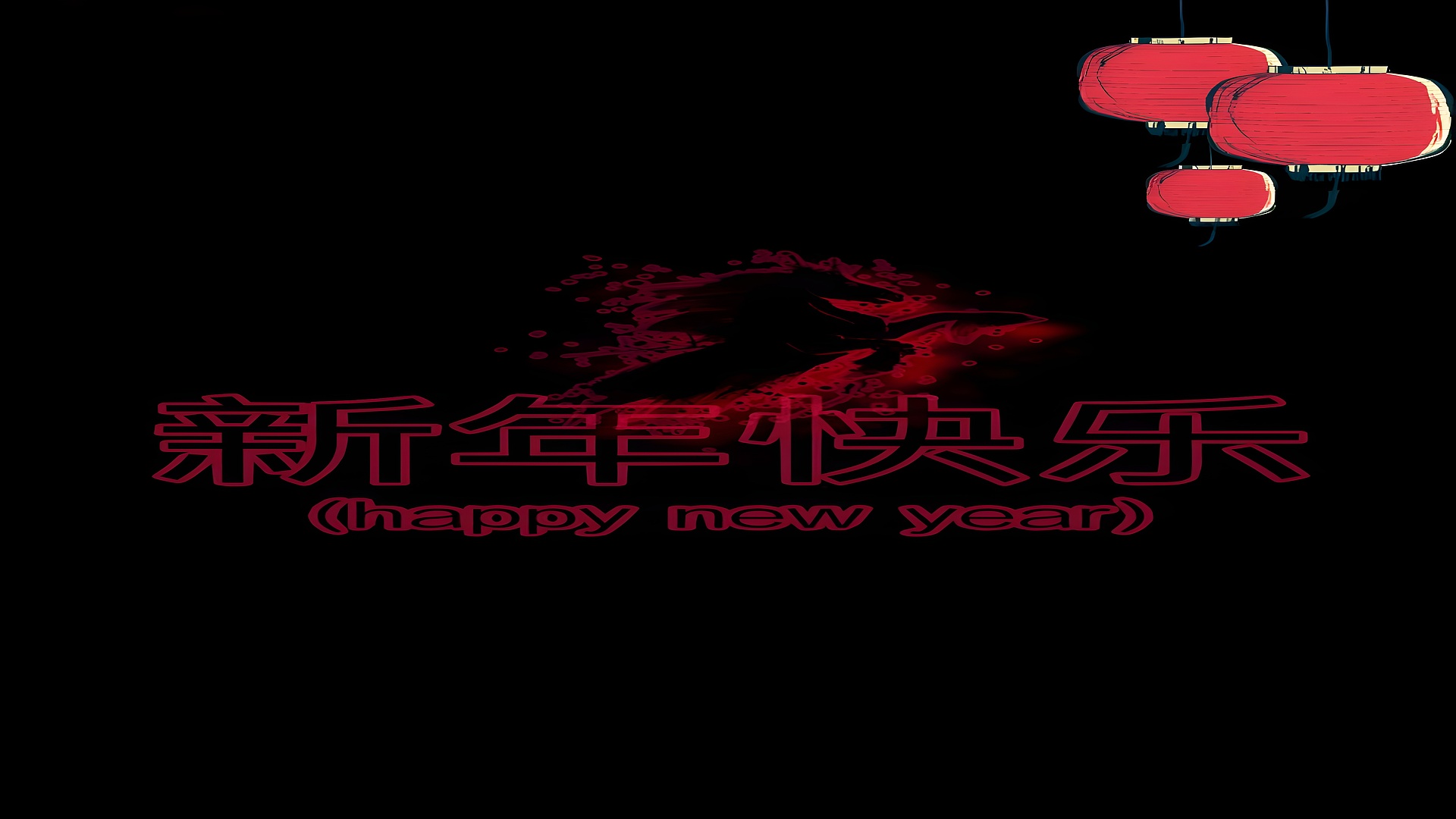 This Chinese New Year Lanterns HD Wallpaper beautifully captures the essence of traditional Asian festivities with a modern digital art twist. The main visual focus is on three vibrant red lanterns hanging gracefully against a stark black background, creating a striking contrast that immediately draws the eye. Below the lanterns, a dynamic silhouette of a horse emerges in deep crimson hues, surrounded by splashes of red that evoke energy and movement. The Chinese characters 新年快乐, meaning "Happy New Year," are prominently displayed in bold red strokes with a subtle glow, accompanied by the English translation in a matching style, reinforcing the celebratory theme.