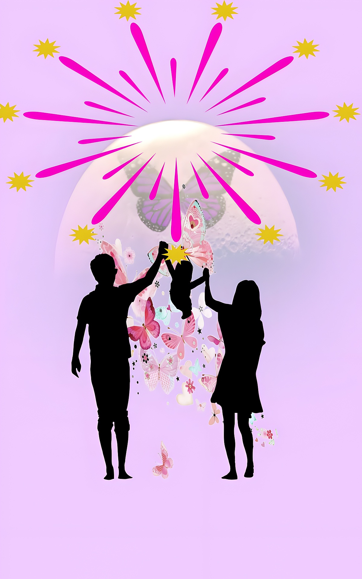 Family Moonlight Fantasy HD wallpaper captures a heartwarming silhouette of two adults joyfully lifting a child into the air, surrounded by a flurry of pink butterflies and delicate floral accents. The dreamy backdrop features a soft gradient of lavender hues, evoking a sense of serenity and wonder. Above the trio, a radiant moon glows behind bursts of pink and yellow star-like shapes, adding a magical touch to the composition.