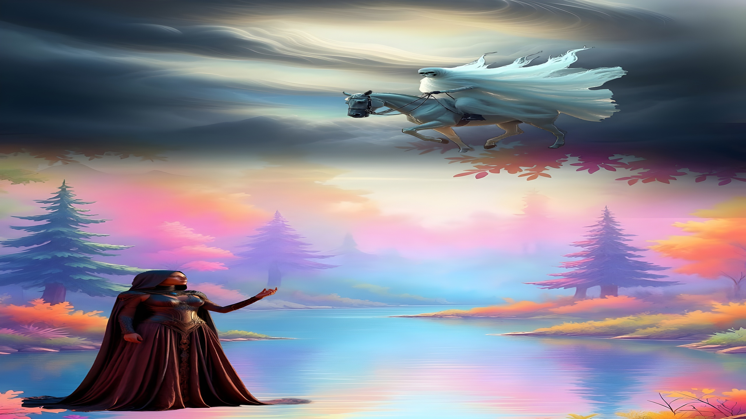 Ghost Rider Autumn Lake captures a breathtaking contrast between the mystical and the serene. In the upper half, a ghostly figure in flowing white robes rides a pale horse through a stormy, swirling sky—an ethereal presence that evokes mystery and power. Below, a tranquil autumn landscape unfolds, with vibrant trees in shades of orange, pink, and purple reflecting in a calm lake. A cloaked figure stands at the water’s edge, reaching toward the spectral rider above, bridging the realms of fantasy and reality. This surreal composition blends drama and peace, making it a captivating HD wallpaper for fantasy lovers and dreamers alike.