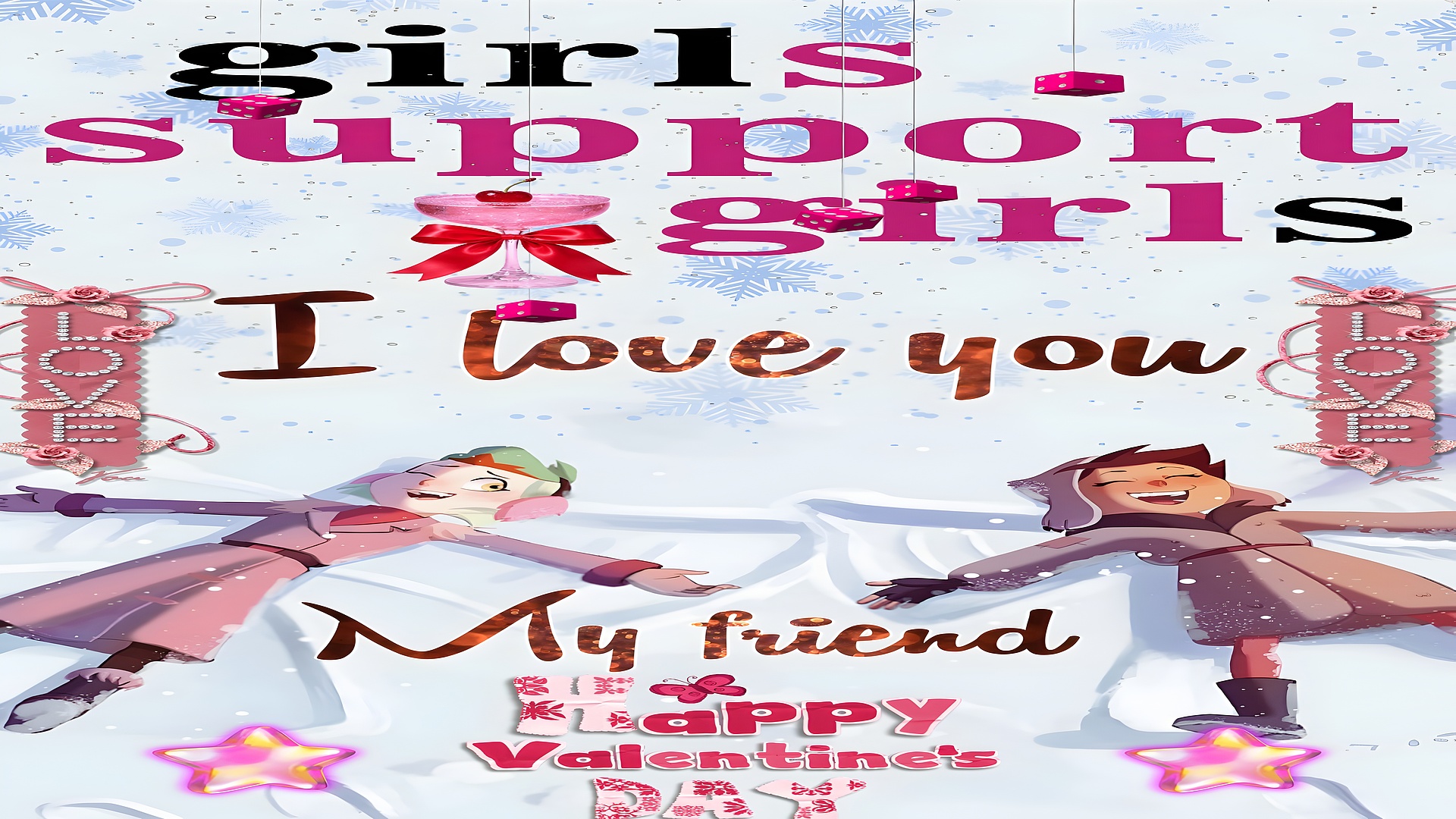 The central message "girls support girls" is boldly displayed in a mix of black and deep magenta fonts, with playful pink dice hanging around the text, adding a whimsical decorative element. Additional heartfelt phrases like "I love you my friend" and "Happy Valentine's Day" are artistically integrated, emphasizing themes of love, friendship, and celebration. The overall composition combines vibrant colors and joyful expressions, making this wallpaper a perfect choice for those seeking a high-resolution wallpaper that celebrates friendship and Valentine's Day in a fun, wintery setting.