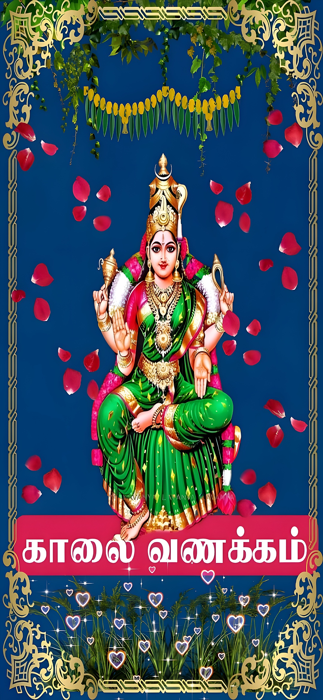 This premium HD wallpaper showcases a harmonious palette of emerald green, golden yellow, deep blue, and vibrant red, creating a visually captivating and spiritually uplifting atmosphere. The goddess’s serene expression and detailed jewelry highlight the artistic craftsmanship typical of traditional Indian religious art. The use of gold in the frame and accessories symbolizes wealth and divine energy, while the lush green saree represents fertility and growth. The floating rose petals and the hanging garland evoke a festive mood, often associated with religious celebrations and rituals. This wallpaper is perfect for those interested in Indian culture, Hindu deities, and spiritual wall art, offering a rich visual experience that blends tradition with modern digital artistry.