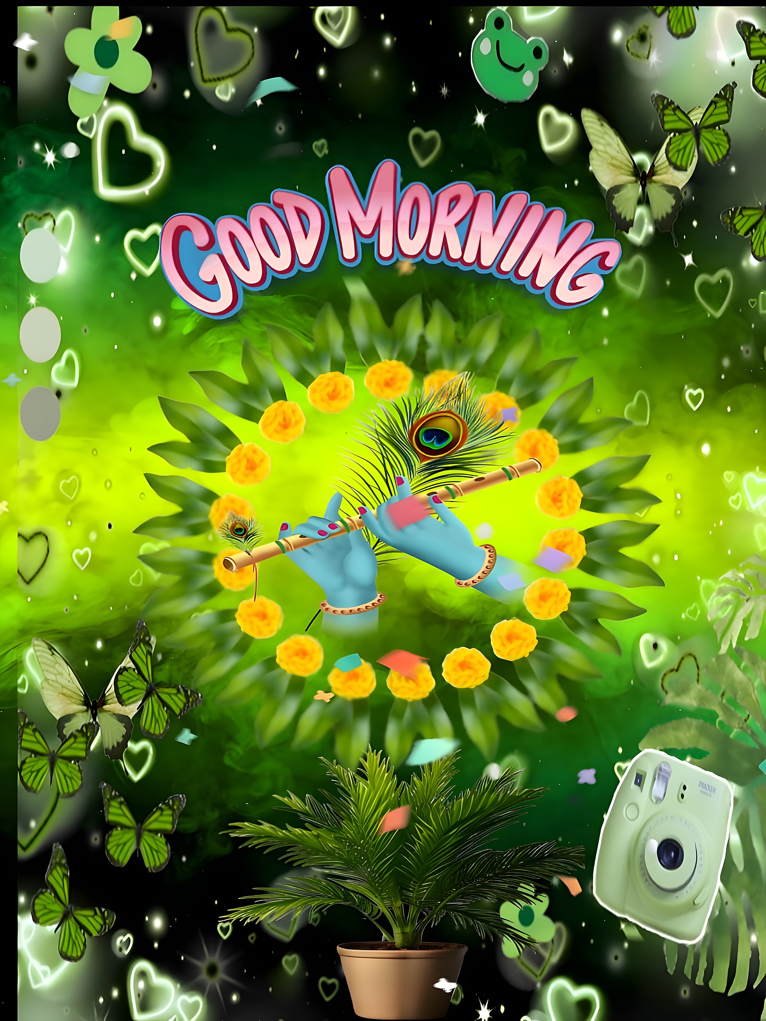 This Good Morning Krishna Flute Art wallpaper beautifully captures a vibrant and spiritual morning scene, perfect for those seeking a devotional and nature-inspired desktop or mobile background. The central focus is on a pair of sky blue hands playing a golden flute, adorned with a striking peacock feather, symbolizing Lord Krishna’s divine presence. Surrounding the hands is a radiant wreath of bright yellow marigold flowers and lush green leaves, creating a harmonious blend of colors that evoke freshness and positivity. The glowing green backdrop, sprinkled with heart-shaped light effects and fluttering butterflies, enhances the serene and uplifting atmosphere of this high-resolution wallpaper.