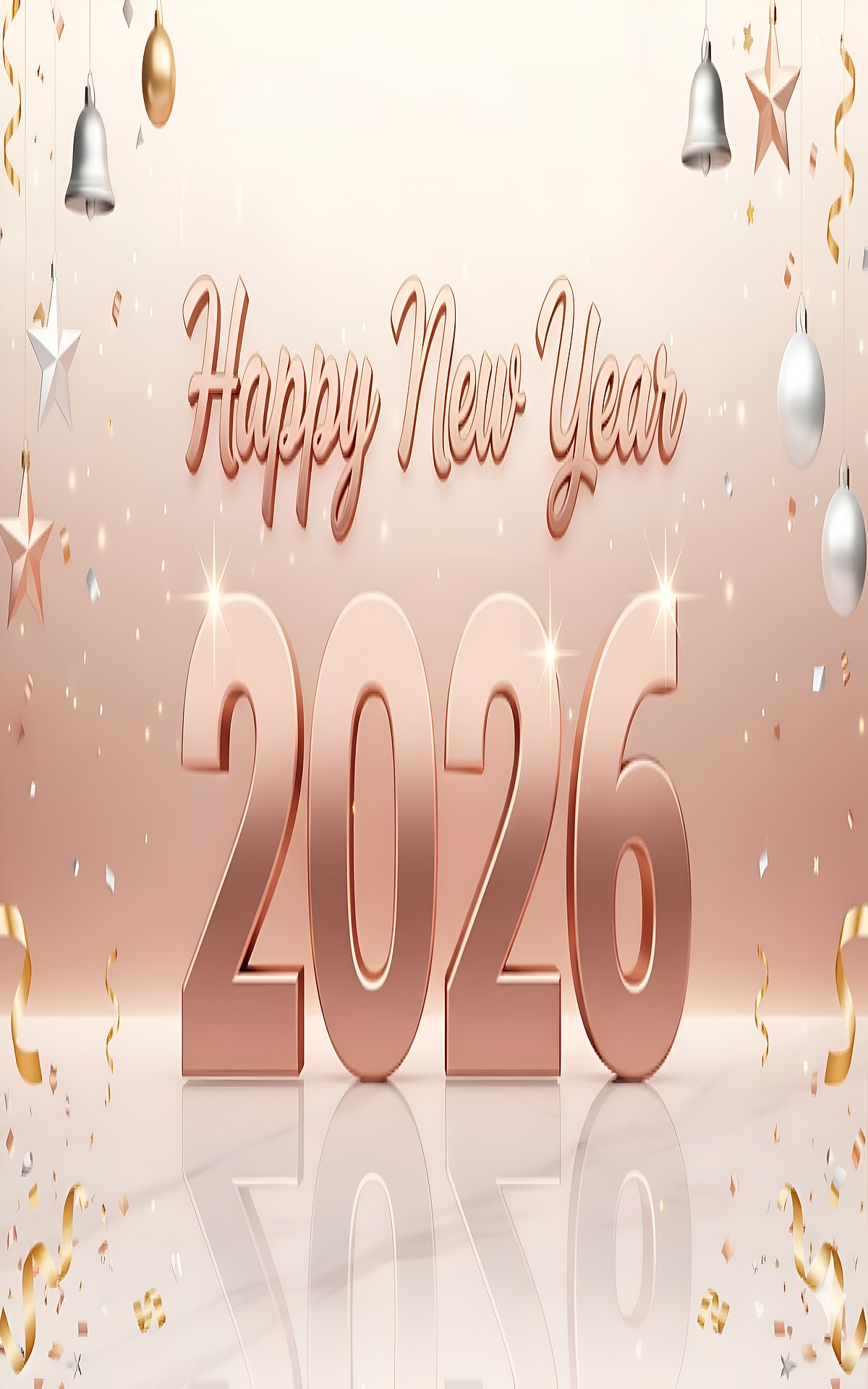The Happy New Year 2026 Celebration Wallpaper features a harmonious blend of rose gold, soft beige, white, and silver tones that create a warm and inviting atmosphere. The large "2026" text anchors the design, surrounded by shimmering stars and subtle decorative spheres that add a celebratory sparkle without overwhelming the composition. The smooth gradients and soft lighting effects contribute to a polished and modern look, making this wallpaper suitable for both personal and professional settings.